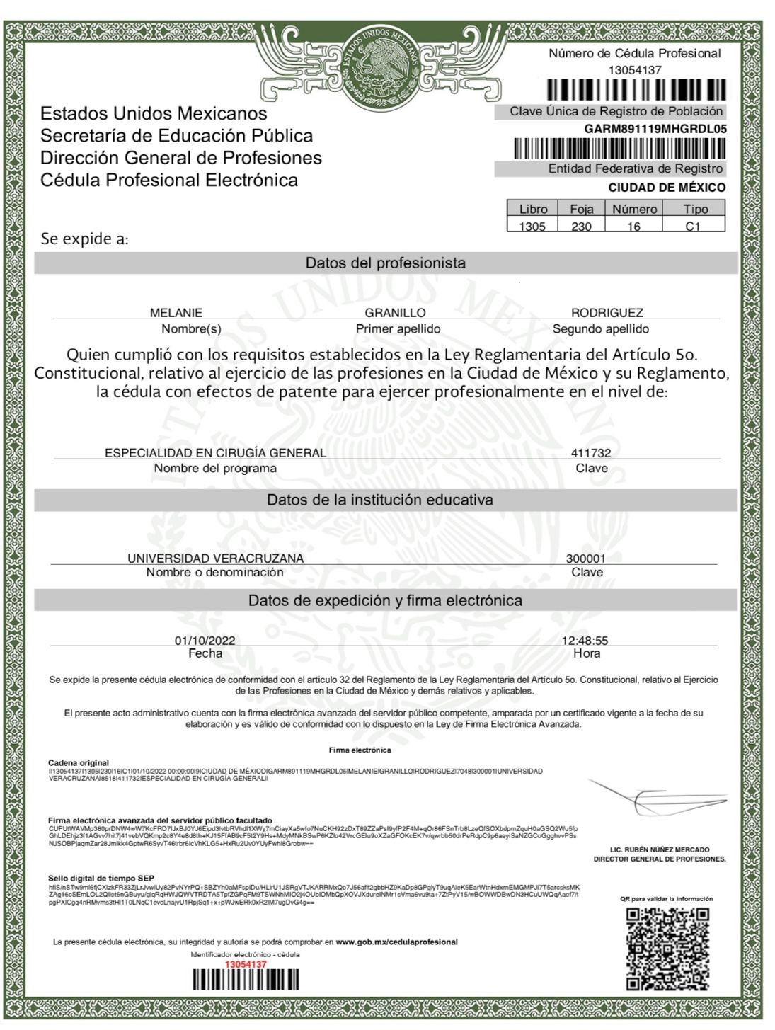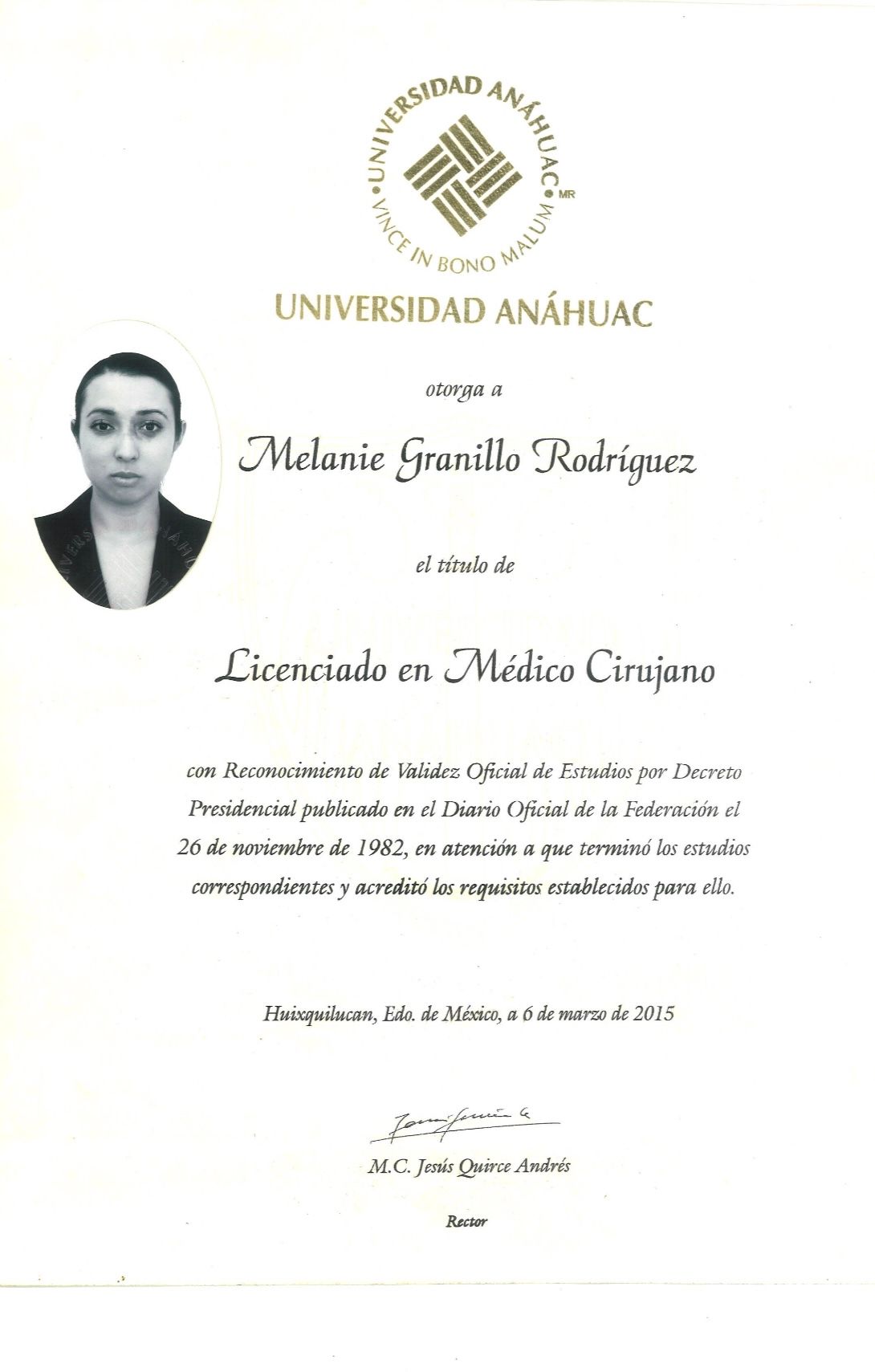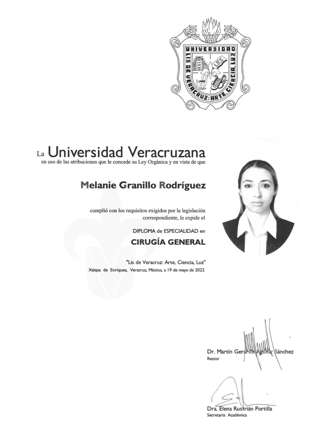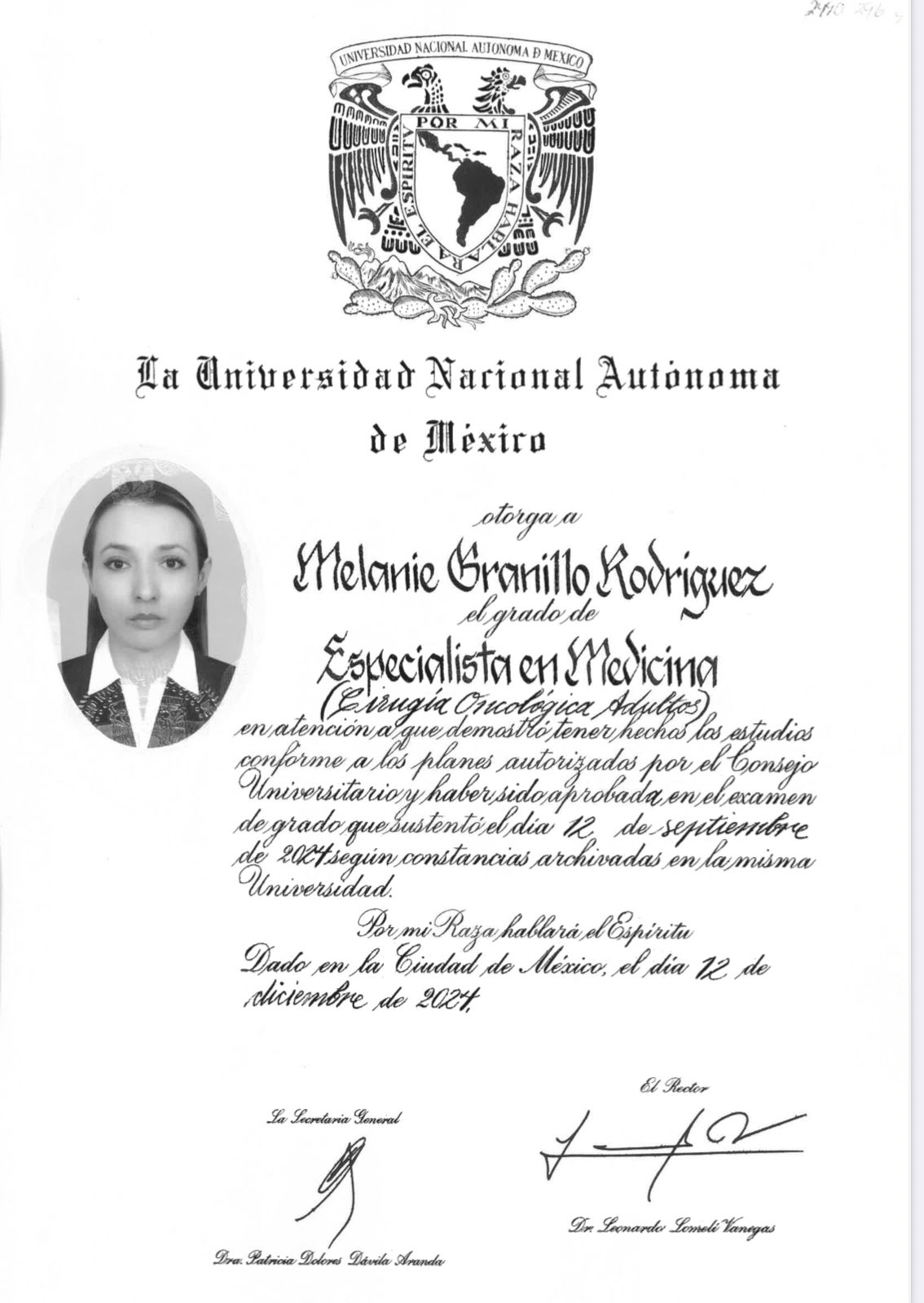 Egresada de CMN 20 de NOVIEMBRE ISSSTE, avalada por UNAM, y Certificada por el CONSEJO MEXICANO DE ONCOLOGIA