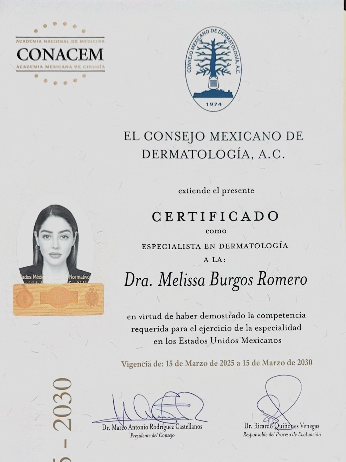 Medico especialista en Dermatología, Certificada por el Consejo Mexicano de Dermatología 2278.