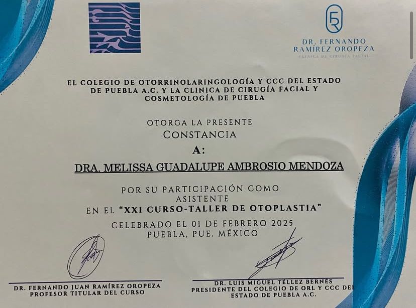 Me encuentro en constante actualización tomando cursos y talleres en cirugía otológica, cirugía estética facial y enfocados a trastornos por apnea del sueño.