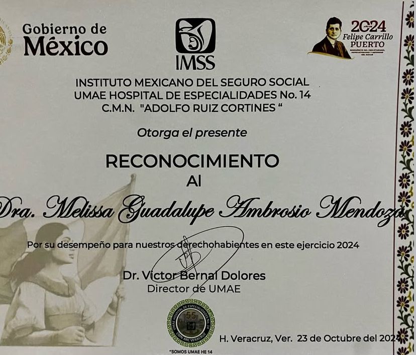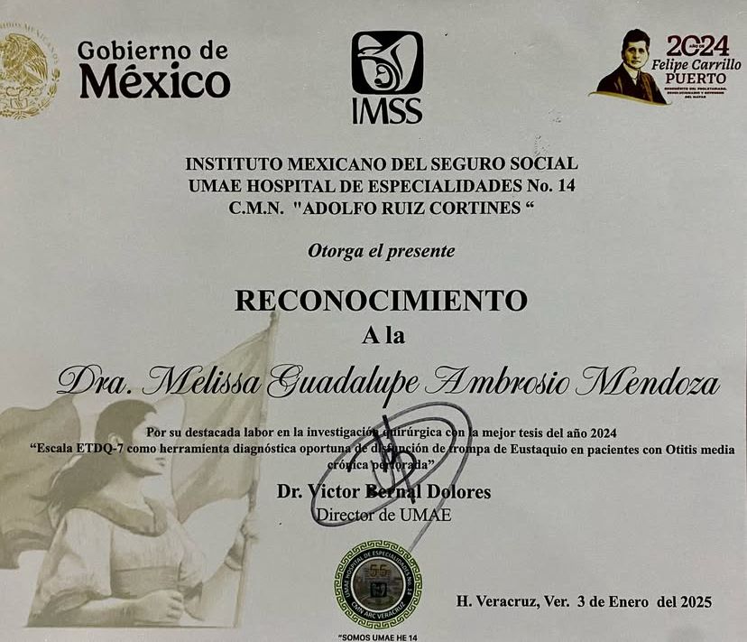 Cuento con las siguientes publicaciones médicas en revistas nacionales: • Ambrosio-Mendoza MG, Avilés-Guzmán MP, Cisneros-Vivas LS, Escobedo-Lara JJ. Escala ETDQ-7 como herramienta diagnóstica oportuna de disfunción de trompa de Eustaquio en pacien-tes con otitis media crónica perforada. An Orl Mex 2024; 69 (2): 83-90. • Ambrosio-Mendoza MG, Jiménez-García A, Herrera-López O. Fibroma condromixoide etmoidal altamente vascularizado. An Orl Mex 2024; 69 (4): 285-290. Y formo parte del grupo de revisores en la revista “International Journal of Surgery Case Reports”.