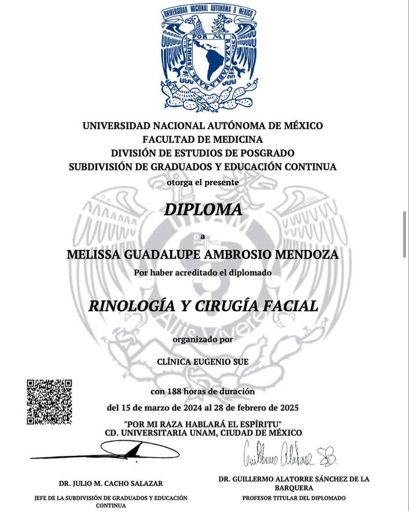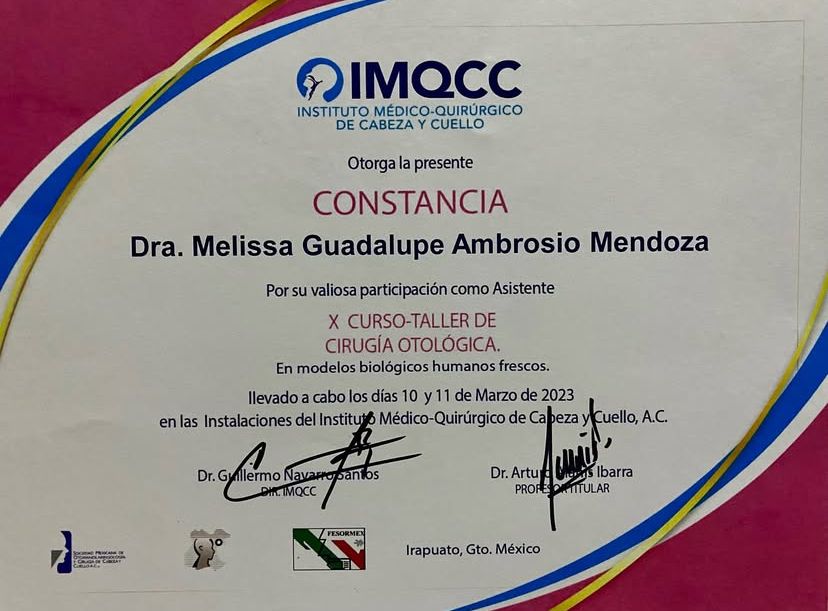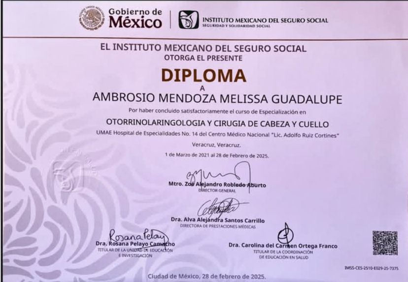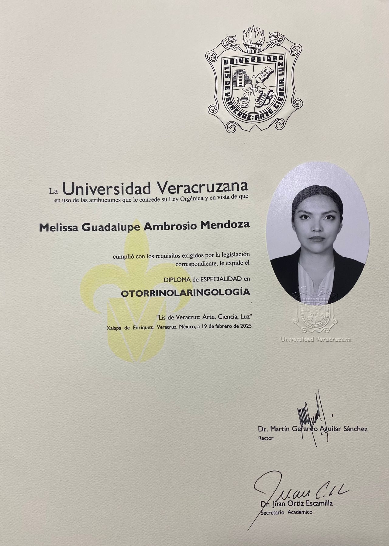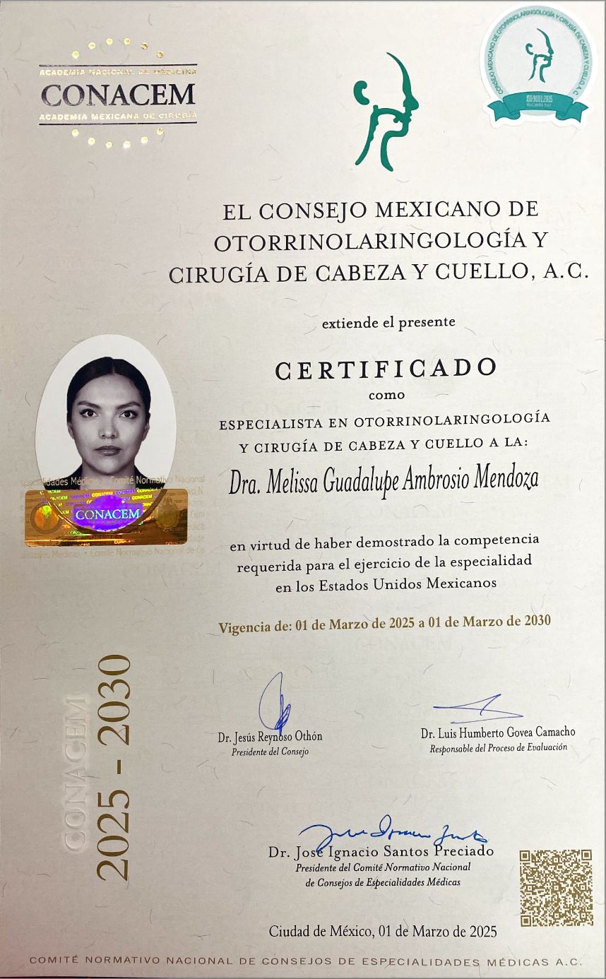 Hola, soy la Dra. Melissa Ambrosio Mendoza, realicé la Licenciatura en Médico Cirujano en la Universidad Autónoma del Estado de Hidalgo (cédula profesional 11776579), posteriormente realicé la Especialidad en Otorrinolaringología y Cirugía de Cabeza y Cuello, en el CMN “Adolfo Ruíz Cortines” UMAE 14 (cédula profesional 14794772 UV) y realicé el Diplomado en Rinología y Cirugía facial por la UNAM. Me encuentro certificada por el consejo mexicano de otorrinolaringología (CMO-220-II/25).