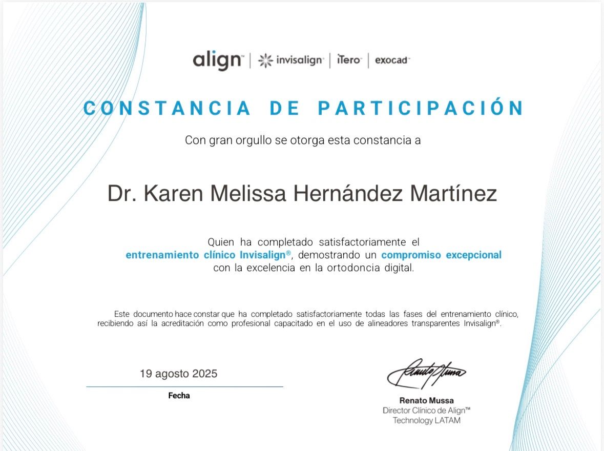 Cuento con certificación para el uso de alineadores INVISALIGN, ofreciendo alternativas estéticas y funcionales según las necesidades de cada paciente.