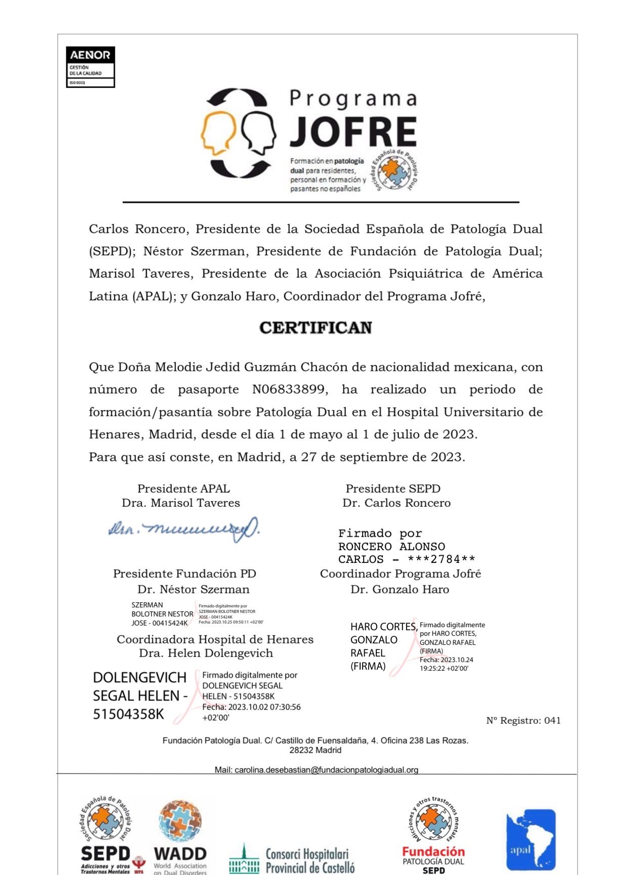 • Patología Dual, enfocada en el tratamiento de pacientes con adicciones asociadas a otros trastornos psiquiátricos como depresión, ansiedad, esquizofrenia y otros, realizada a través del Programa Joffrey en el Hospital del Henares, Madrid, España.