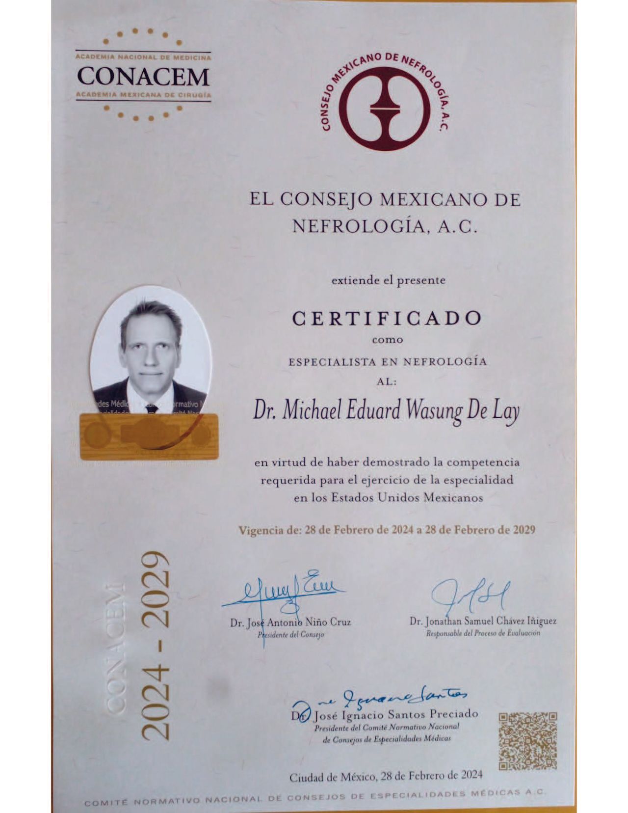 El Dr. Michael Eduard Wasung De Lay cursó la Licenciatura como Médico Cirujano en la Universidad Anáhuac. Además, cuenta con dos especialidades, una en Nefrología por la Universidad Nacional Autónoma de México (UNAM) y otra en Medicina Interna por la misma institución. Cursó una Maestría en Ciencias de la UNAM y es Profesor titular de la especialidad Nefrología del Hospital Central Sur de Alta Especialidad Petróleos Mexicanos