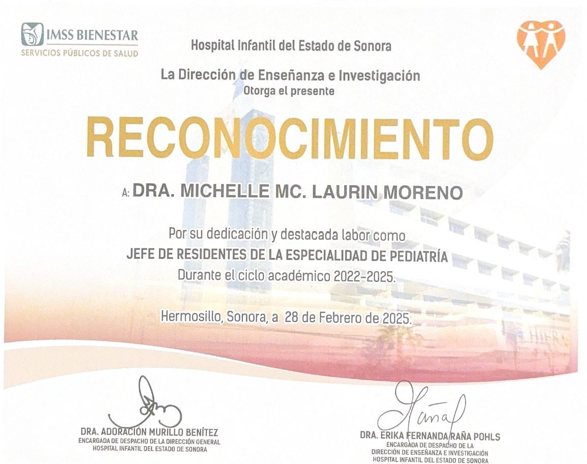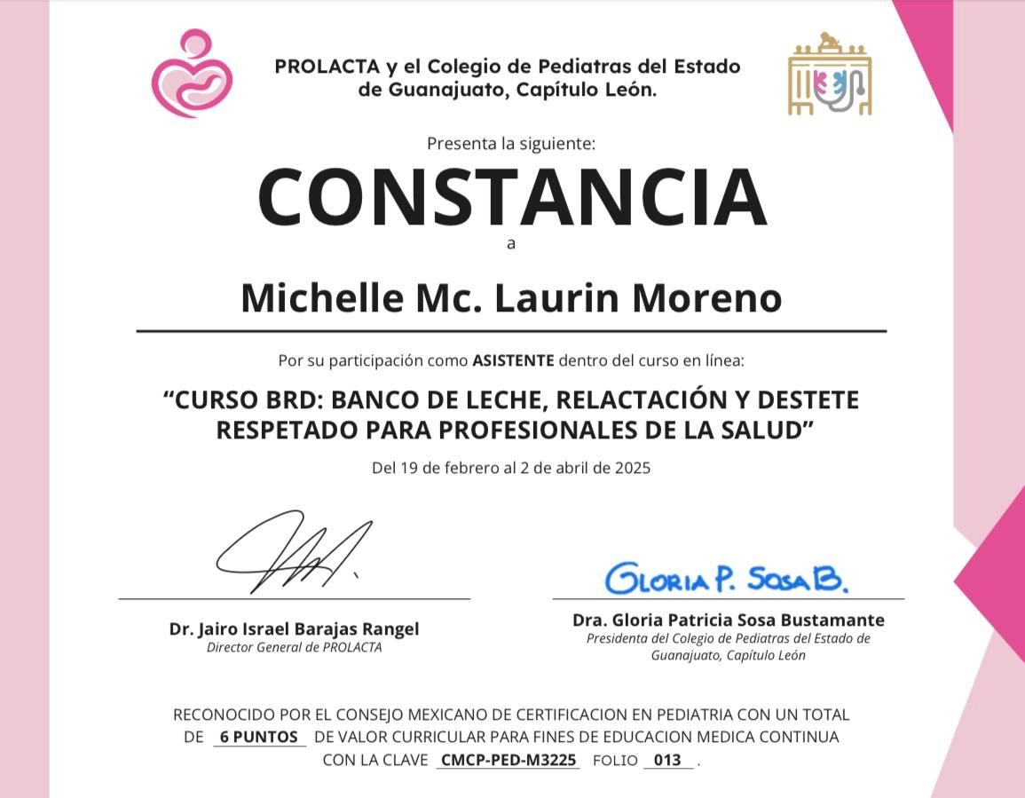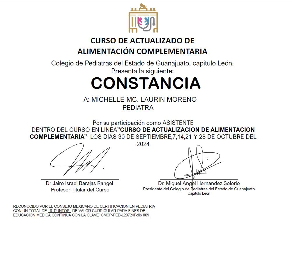 Bienvenidos a mi perfil de Doctoralia! Me da mucho gusto recibirlos en este espacio. Soy la doctora Michelle Mc. Laurin Moreno, pediatra egresada de la XLIV generación de Pediatría del Hospital Infantil del Estado de Sonora. Además de ser pediatra, estoy acreditada como Asesora de Lactancia (Prolacta), Asesora de Alimentación Complementaria (Prolacta) y Asesora de Sueño Infantil con enfoque respetuoso (Prolactar - España). Mi enfoque en la consulta es "respetuoso", es decir, me interesa ser una acompañante y una amiga en la crianza de tu hijo, acompañando no solamente su crecimiento y desarrollo físico sino su desarrollo como persona.