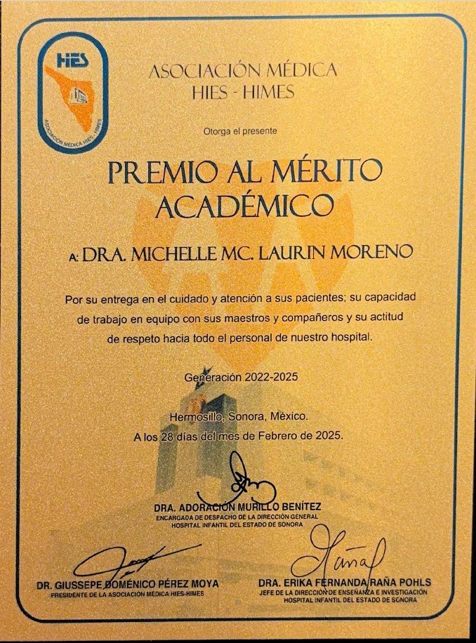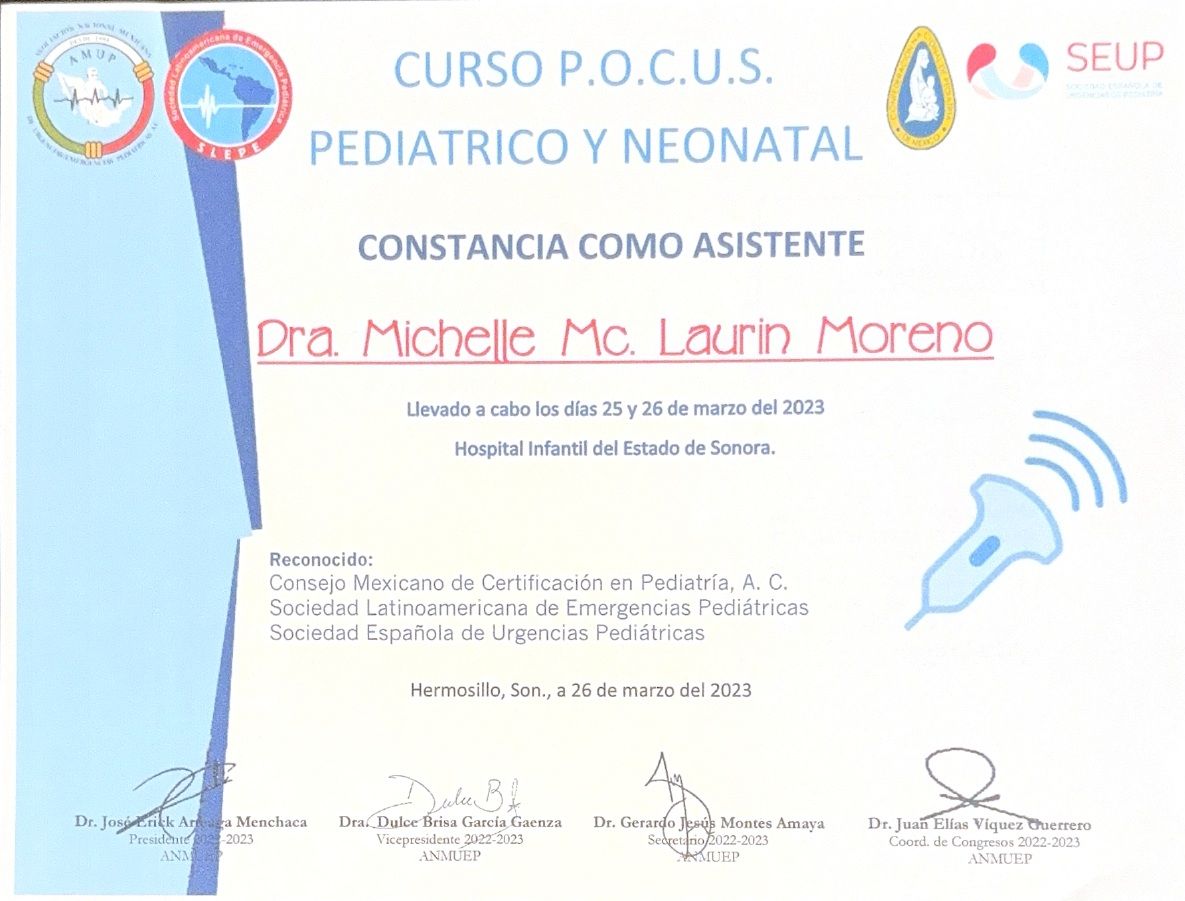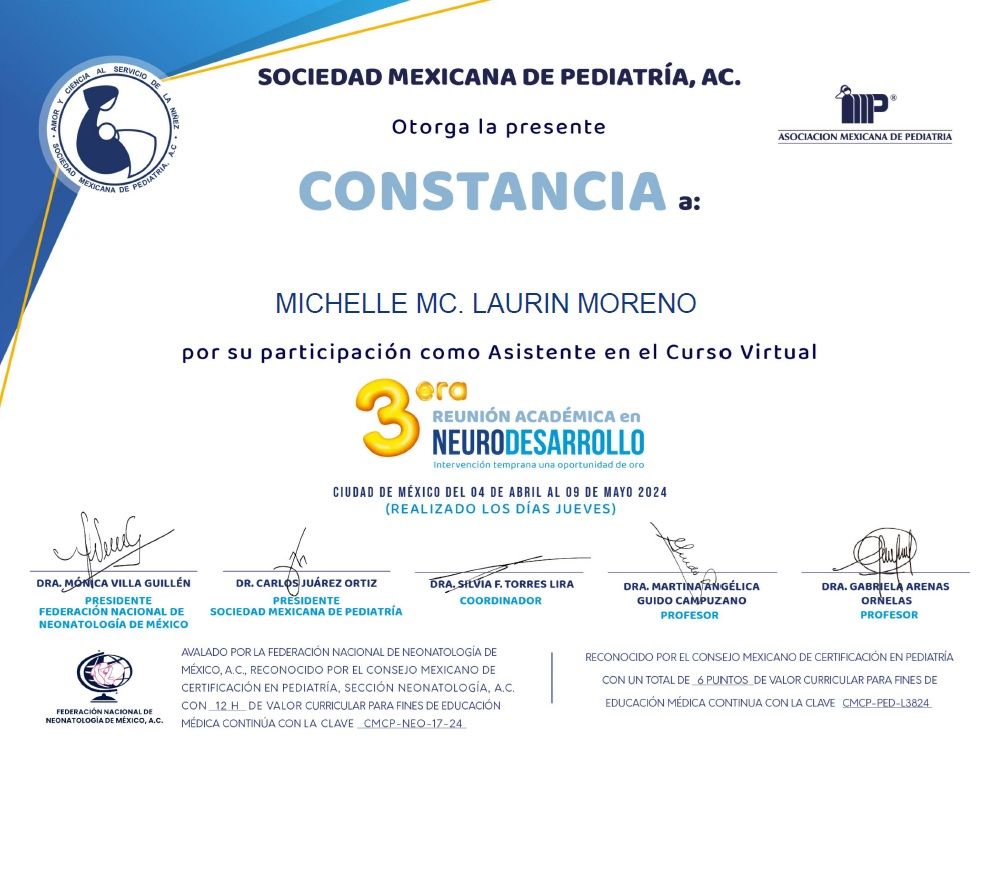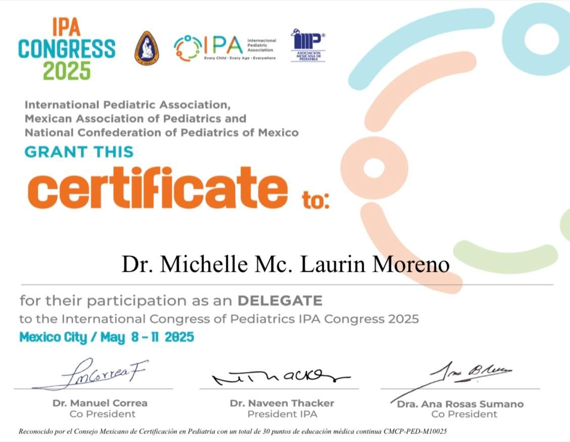 Bienvenidos a mi perfil de Doctoralia! Me da mucho gusto recibirlos en este espacio. Soy la doctora Michelle Mc. Laurin Moreno, pediatra egresada de la XLIV generación de Pediatría del Hospital Infantil del Estado de Sonora. Además de ser pediatra, estoy acreditada como Asesora de Lactancia (Prolacta), Asesora de Alimentación Complementaria (Prolacta) y Asesora de Sueño Infantil con enfoque respetuoso (Prolactar - España). Mi enfoque en la consulta es "respetuoso", es decir, me interesa ser una acompañante y una amiga en la crianza de tu hijo, acompañando no solamente su crecimiento y desarrollo físico sino su desarrollo como persona.