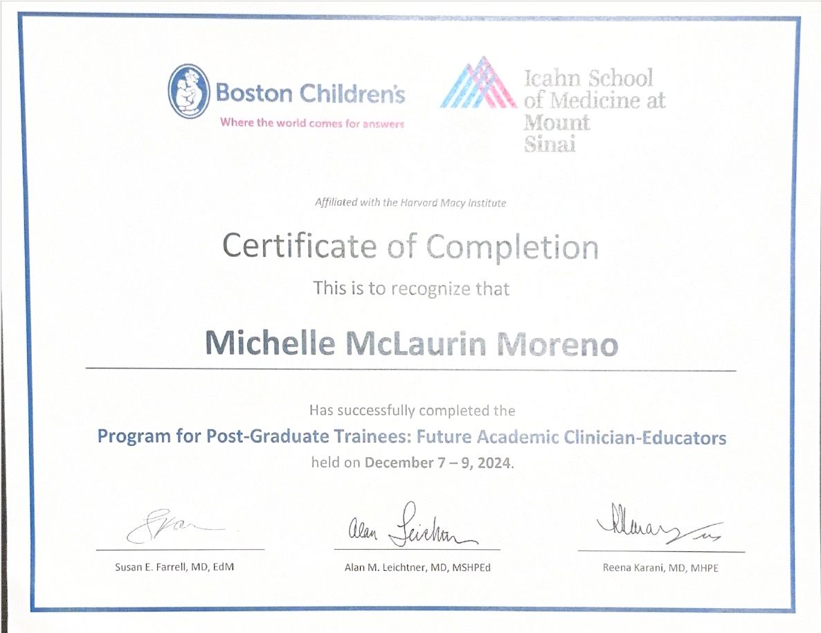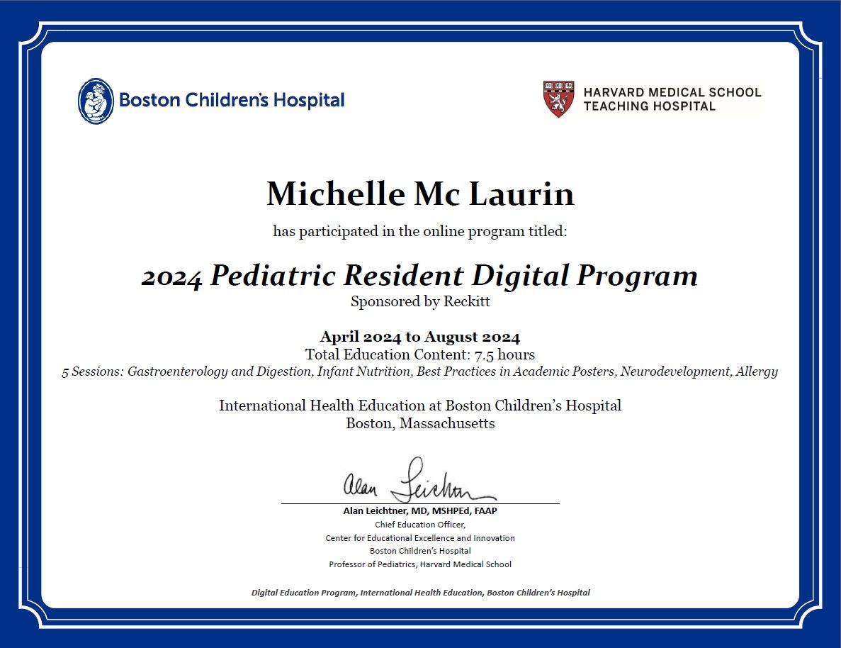 Mi experiencia internacional incluye haber sido acreedora de una de las 15 becas a nivel mundial "Reckitt Global Resident Program" en 2024 para asistir a un programa educativo presencial en el prestigioso "Boston Children's Hospital", hospital de enseñanza en pediatría de la Facultad de Medicina de Harvard. Posteriormente en diciembre 2024 fui elegida para participar en el curso "Post Graduate Medical Educators: Future Academic Clinician-Educators" por parte del Boston Children's Hospital, Mount Sinai Icahn School of Medicine y el Harvard Macy Institute, con enfoque en Educación Médica.