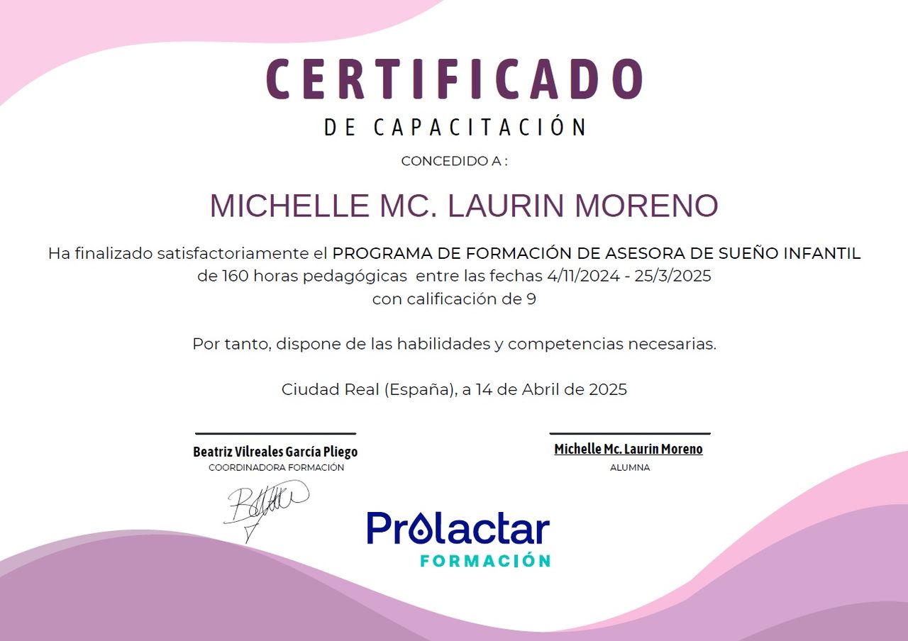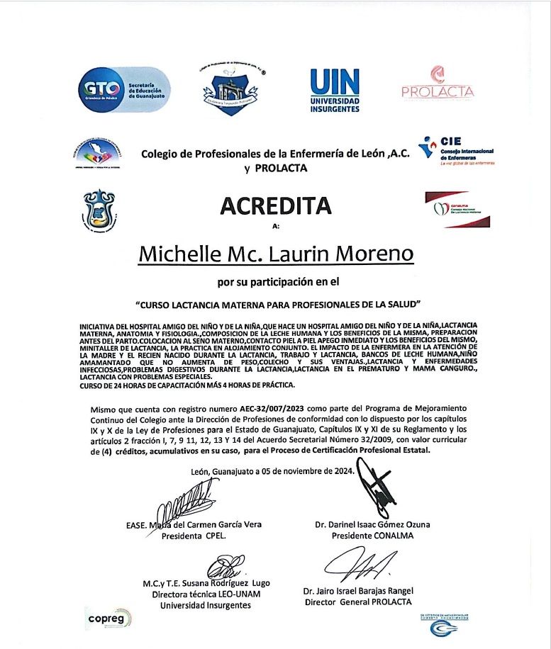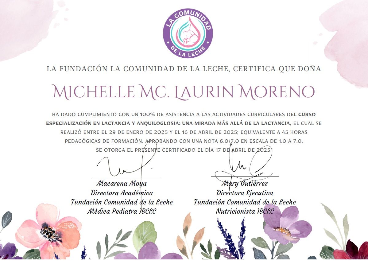 Recientemente he participado en múltiples diplomados, incluyendo de Banco de Leche + Relactación + Destete y Anquiloglosia (frenillo corto) para complementar mi formación como Asesora de Lactancia. Además me encuentro cursando un diplomado de Puericultura y Desarrollo Infantil, clave para el seguimiento de los niños en la consulta.