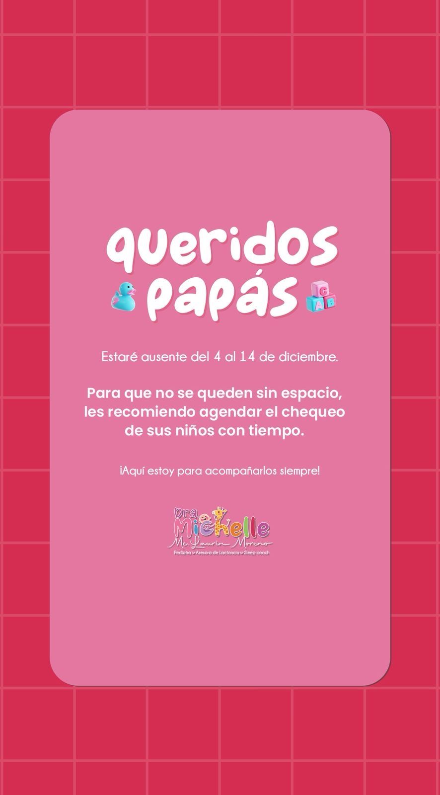 ¡Me encantaría que me permitas acompañarte en el crecimiento y desarrollo de tu hijo, desde la etapa prenatal hasta la adolescencia! Nos vemos en la consulta.