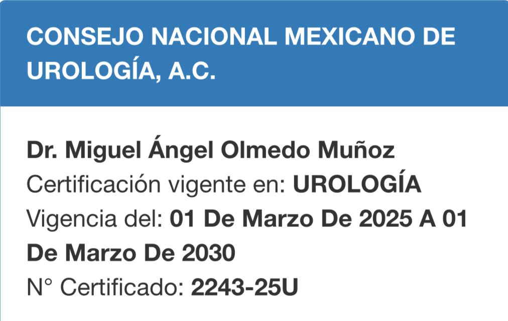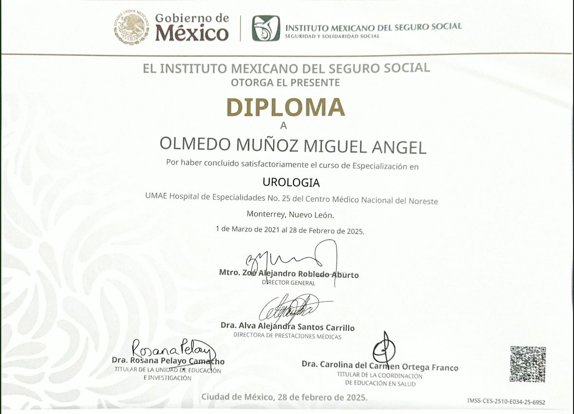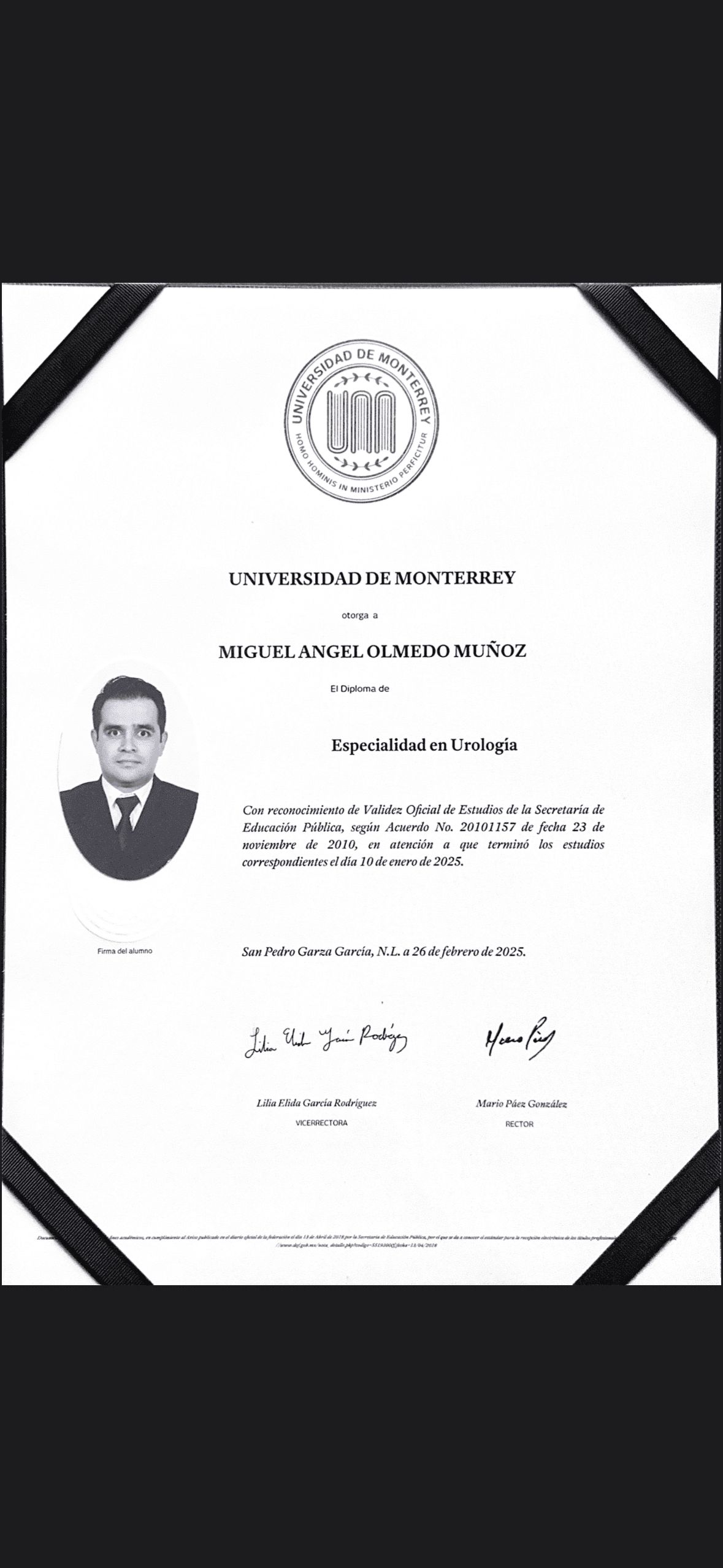 Cirujano Urólogo, certificado por el Consejo Mexicano de Urología y egresado del Centro médico nacional del Noreste (Unidad médica de alta especialidad #25) en la ciudad de Monterrey, NL. Puedo ayudarte con diagnóstico oportuno de enfermedades del tracto urinario y tratamiento especializado mínimamente invasivo.