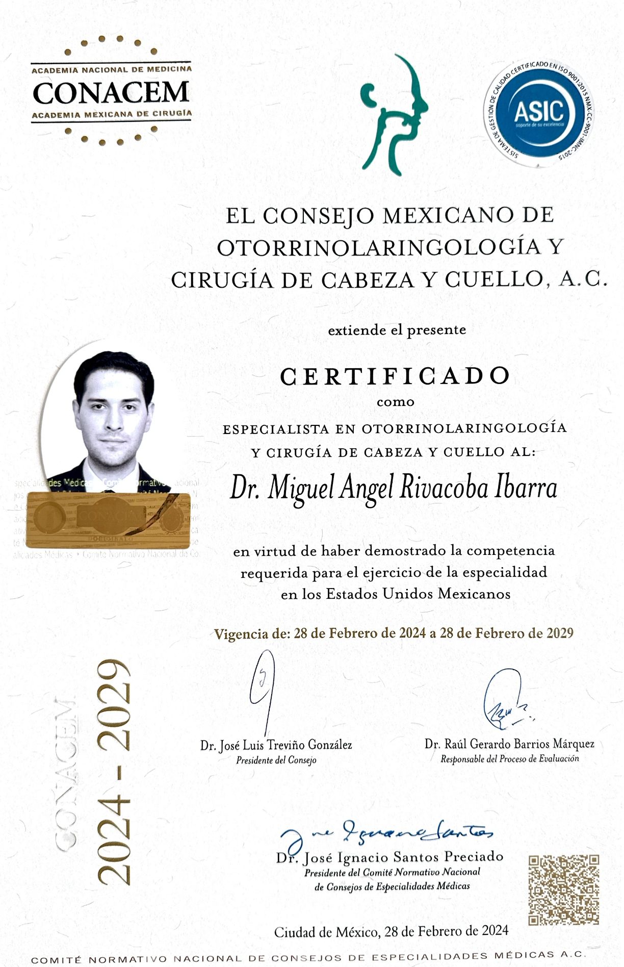 - Certificado ante el Consejo Mexicano de Otorrinolaringología y Cirugía de Cabeza y Cuello (2024-2029, CONACEM)