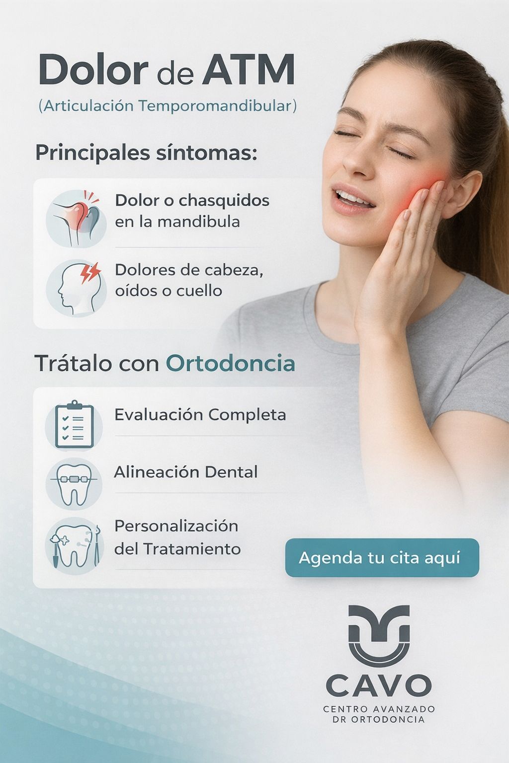 En CAVO – Centro Avanzado de Ortodoncia, realizamos una evaluación especializada de la ATM para identificar la causa del problema y ofrecer el tratamiento adecuado.