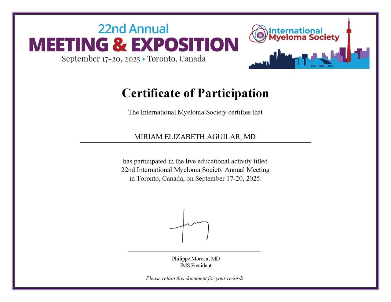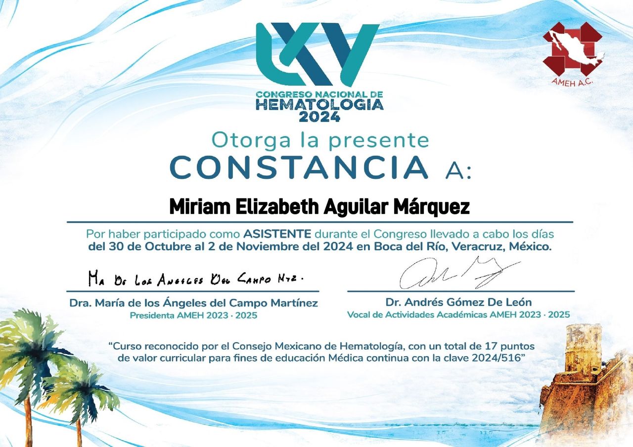 Realicé la subespecialidad en Hematología en el Hospital de Especialidades CMN, Siglo XXI; avalado por la UNAM y actualmente certificada por el Consejo Mexicano de Hematología.
