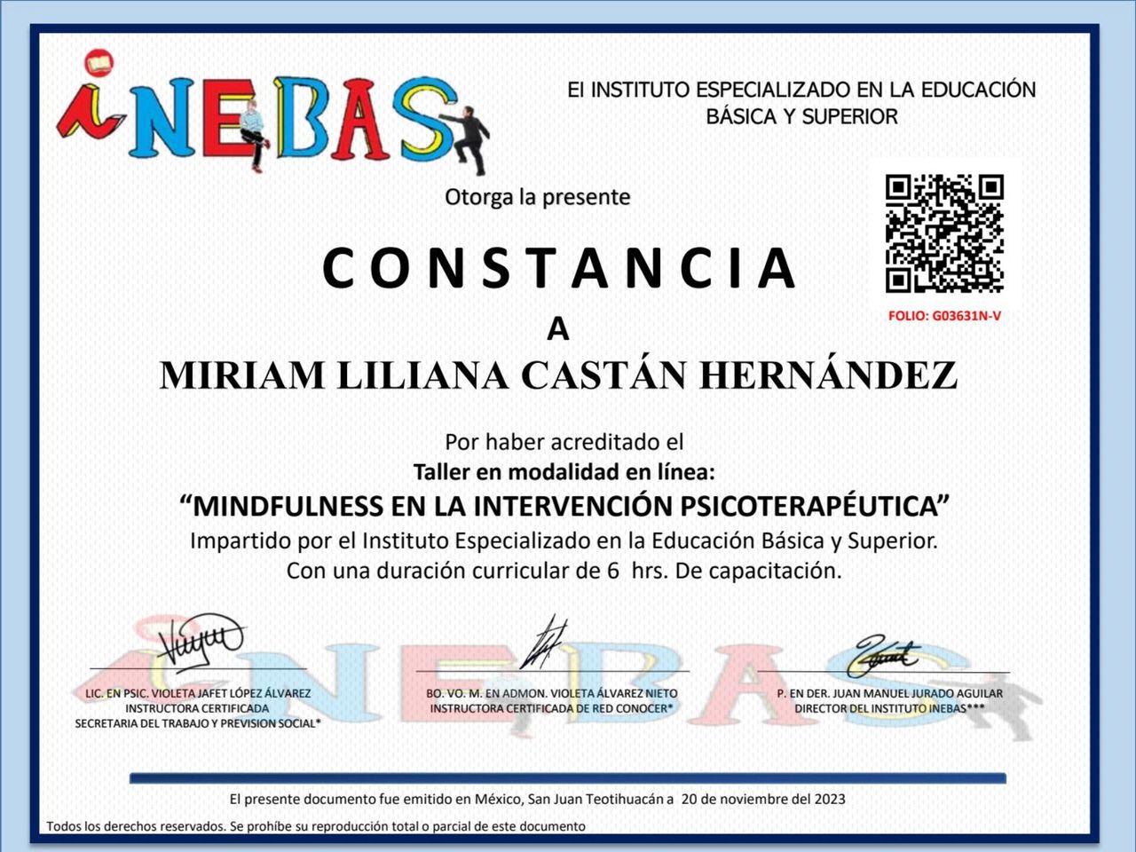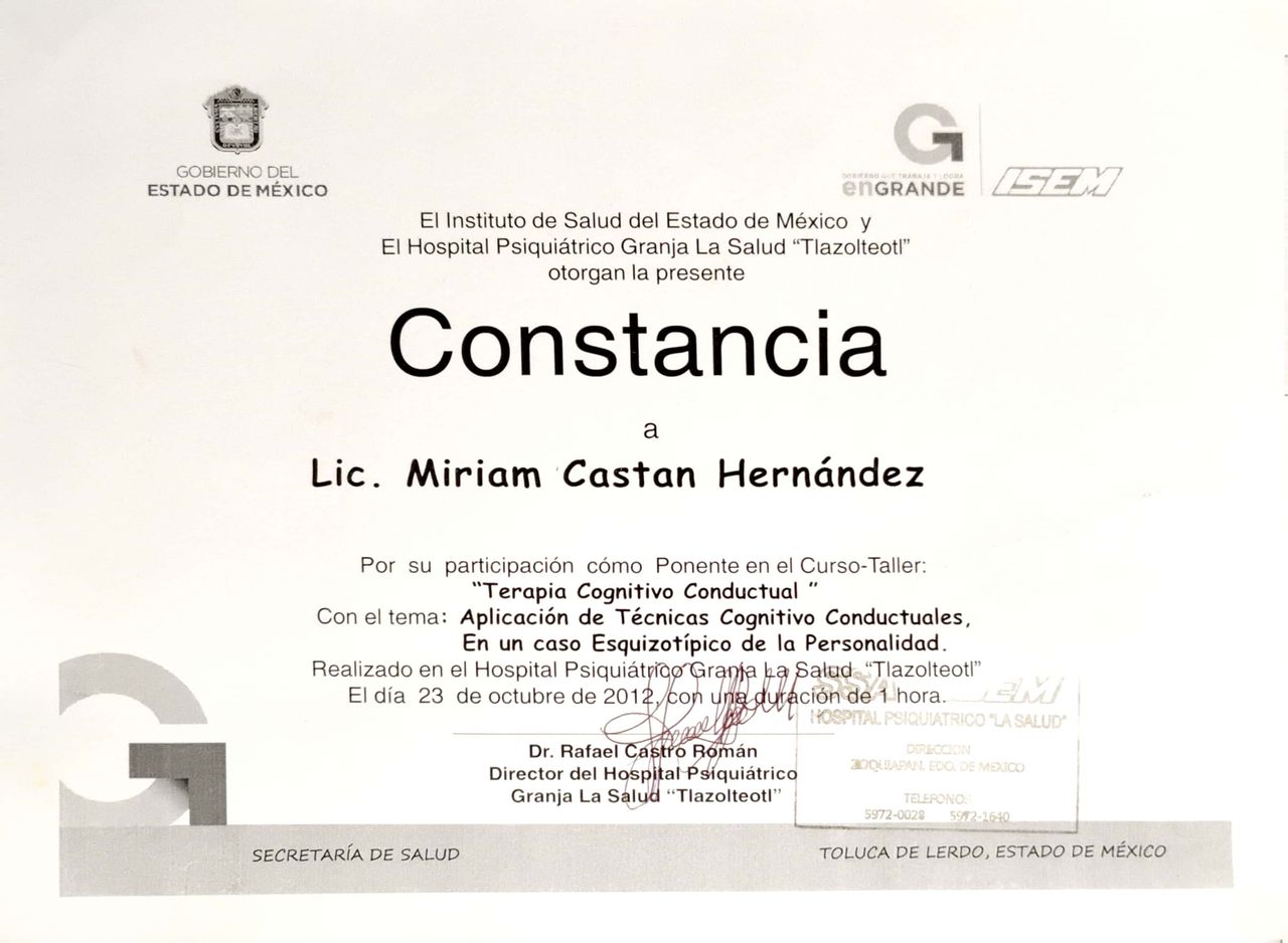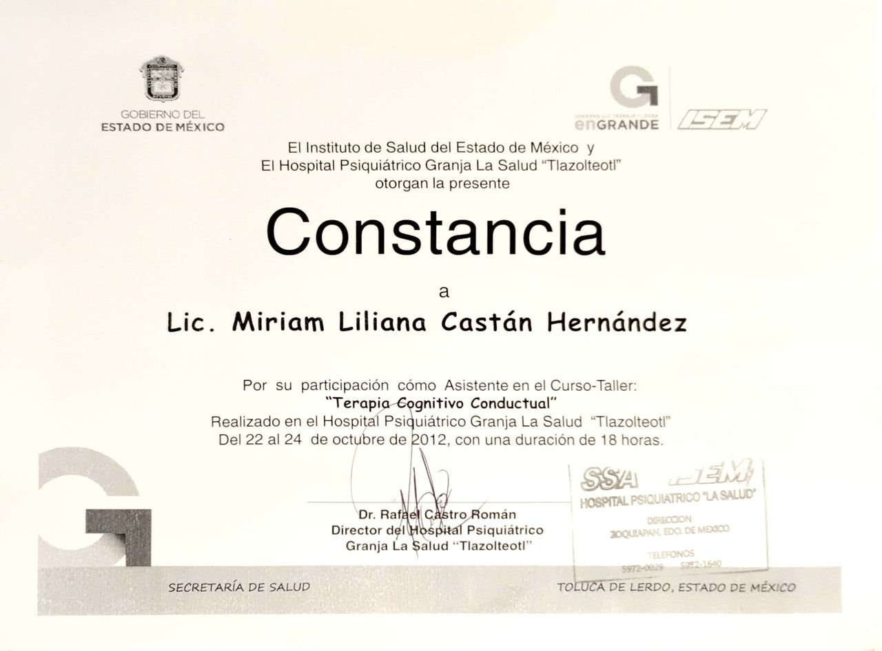 Soy Miriam Castán Hernández, psicóloga con formación y experiencia en Terapia Cognitivo-Conductual (TCC) para adultos. Mi trabajo se centra en brindar un acompañamiento profesional, estructurado y basado en evidencia para el abordaje de ansiedad, depresión, estrés y dificultades emocionales.