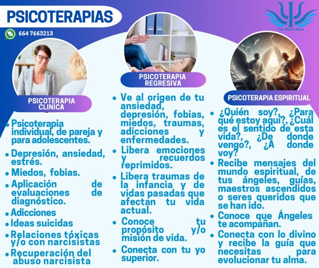 5. Psicoterapia Regresiva: va al origen de tus traumas, miedos, fobias, inseguridades y enfermedades, la cual le permitirá acceder a información de su infancia que no recuerda o a la información registrada en su inconsciente durante su estancia en el vientre materno. Ir al origen le permite acceder a las respuestas que le darán la oportunidad de sanar, de trascender sus miedos y limitaciones para vivir una vida más satisfactoria, con sentido y propósito claro.
