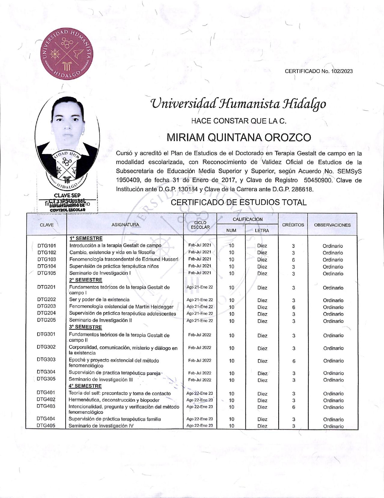 Soy licenciada en psicología con Maestría en psicoterapia Humanista Existencial, en la Universidad Humanista Hidalgo, Ademas tengo un Doctorado en Terapia Gestalt de Campo, actualmente mi titulo de doctora en proceso.