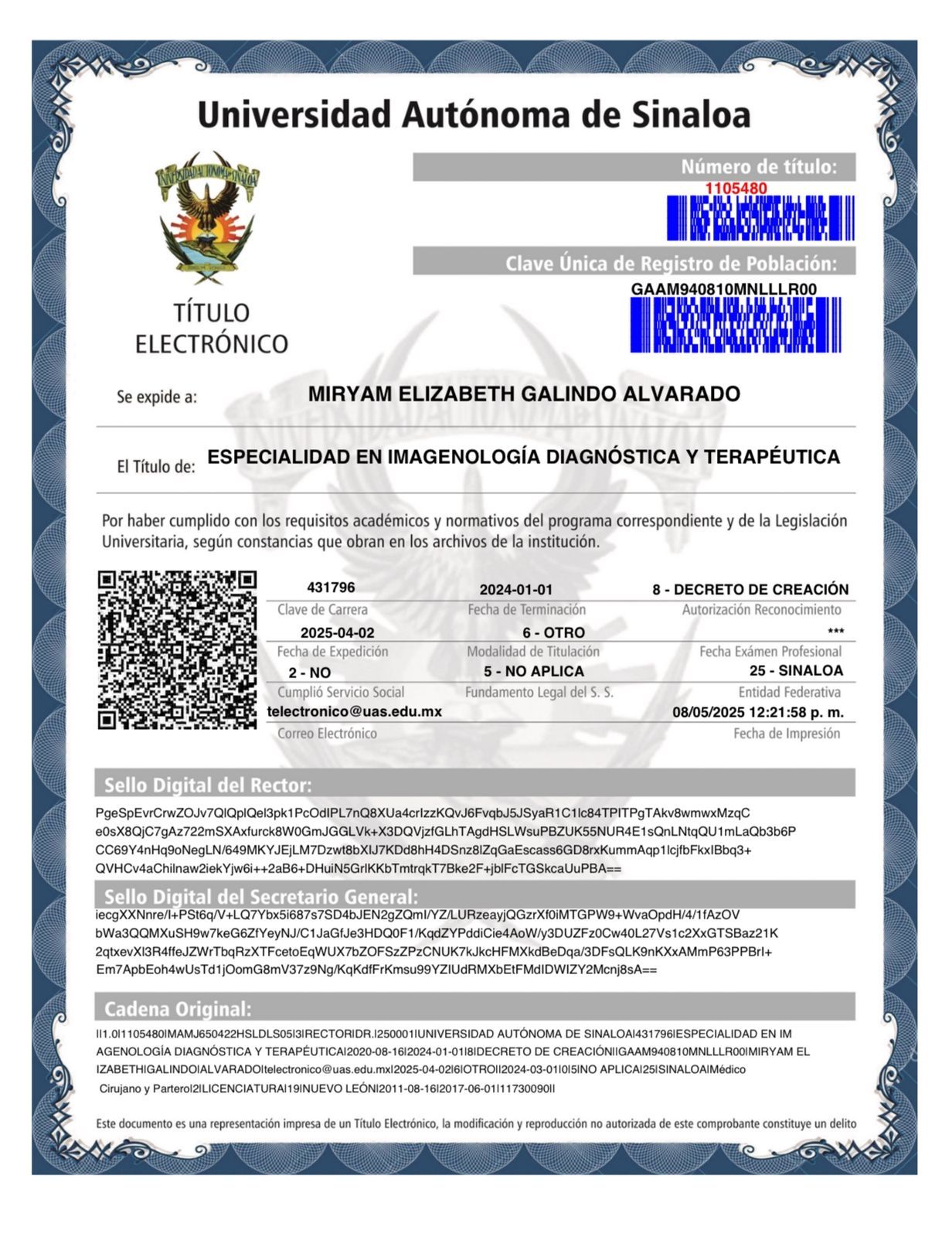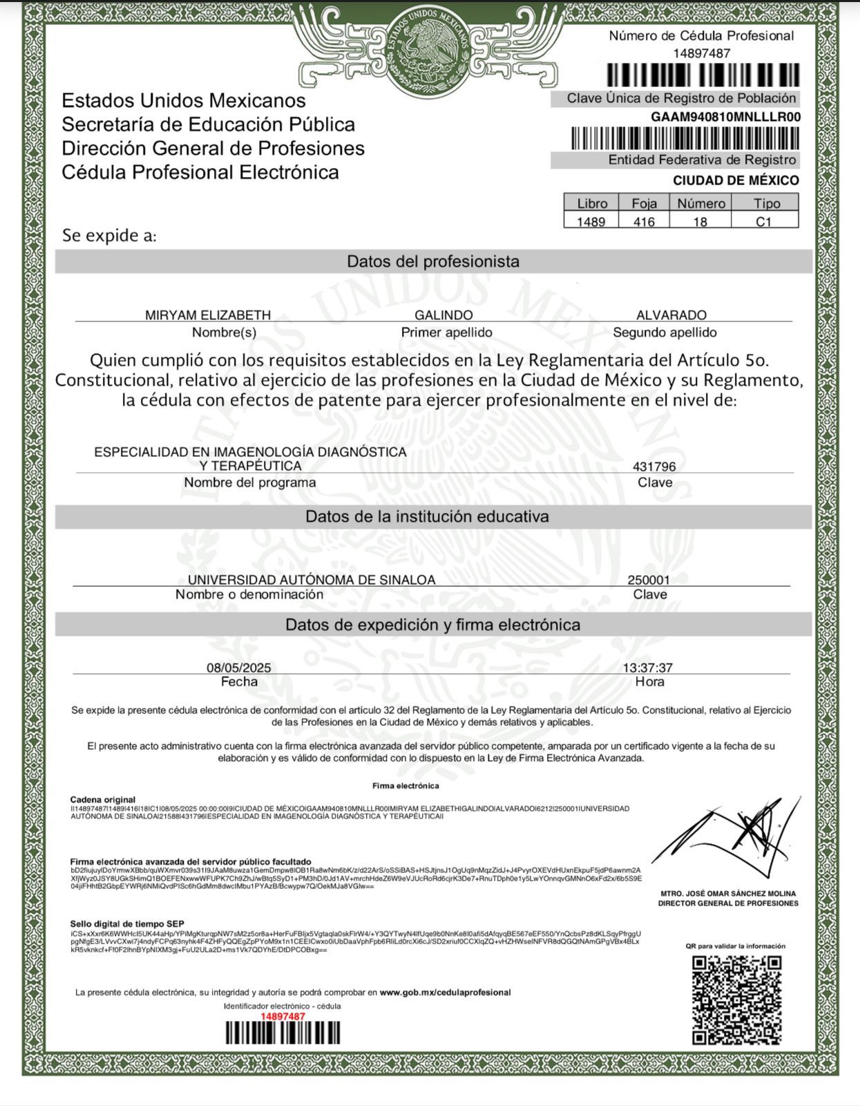 Hola, soy la Dra. Miryam Galindo, radióloga. Estoy aquí para apoyarte en la realización de estudios de ultrasonido, como abdomen total, tiroides, tejidos blandos, así como doppler venoso y arterial, siempre con un enfoque profesional y humano.