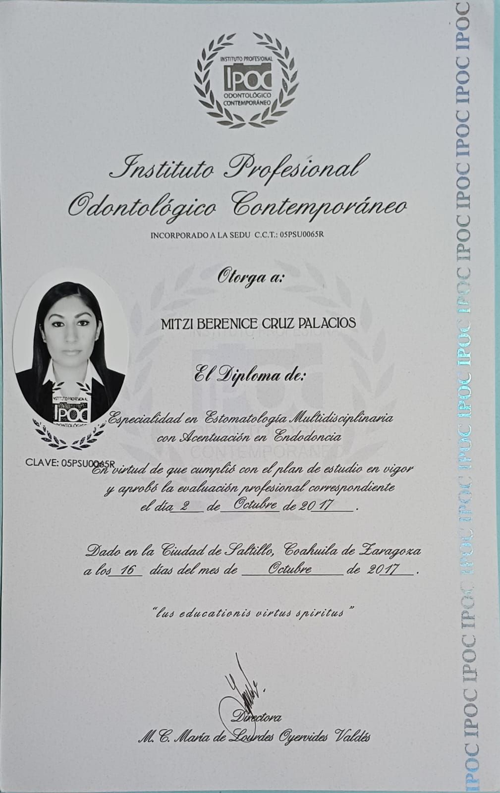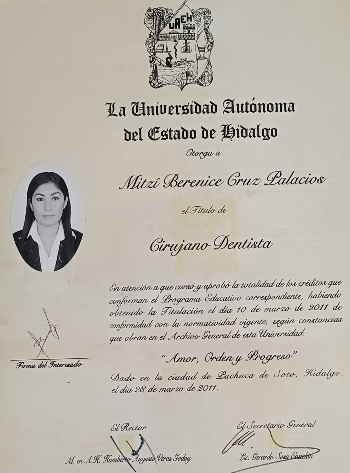 Soy la Dra. Mitzi B. Cruz Palacios odontologa egresada de la Universidad Autónoma del Estado de Hidalgo, especialista en Endodoncia. Tengo más de 15 años de experiencia; asi como actualizaciones constantes.