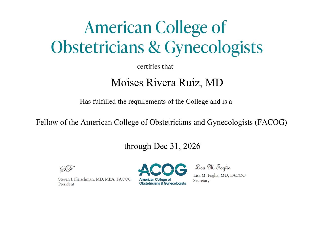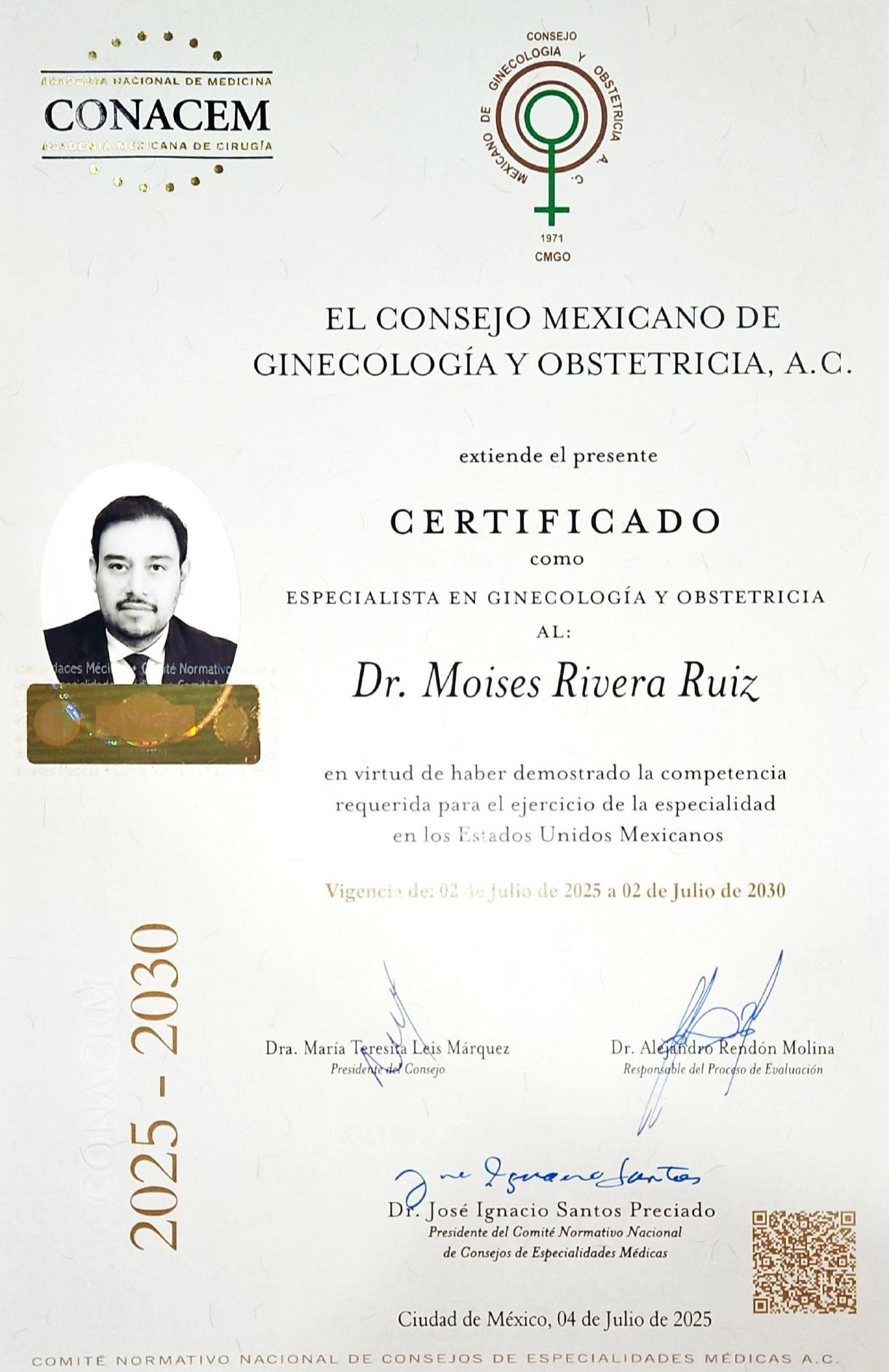 Soy el Dr. Moisés Rivera, médico especialista en Ginecología y Obstetricia, comprometido con brindar atención médica integral, profesional y cercana a cada una de mis pacientes.