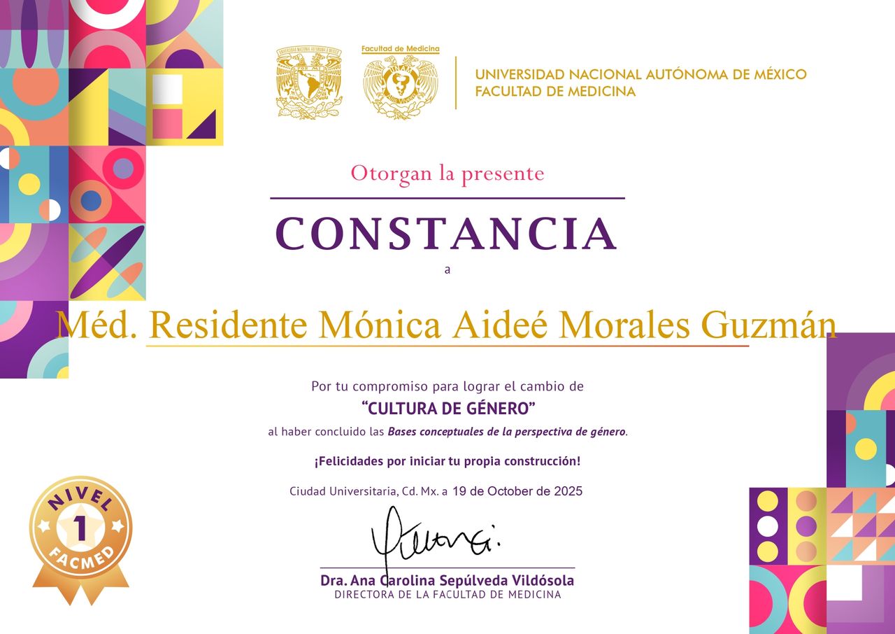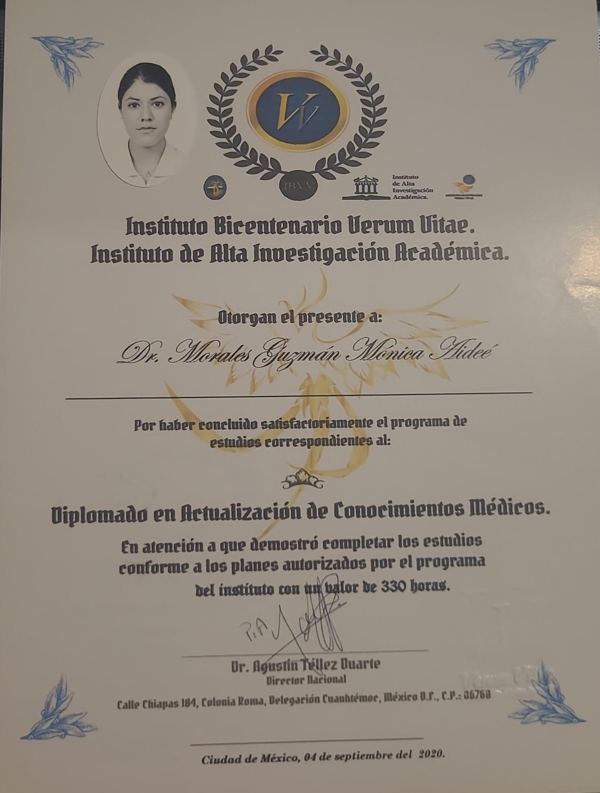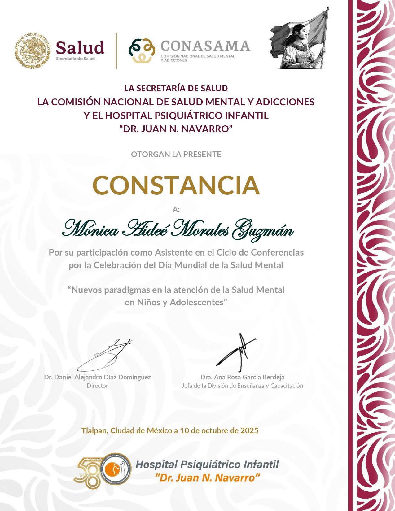 Actualmente continuo mi formación profesional con una subespecialidad en atención psiquiátrica de niños y adolescentes y recién terminé mi maestría en terapia cognitivo conductual (cédula profesional en trámite).