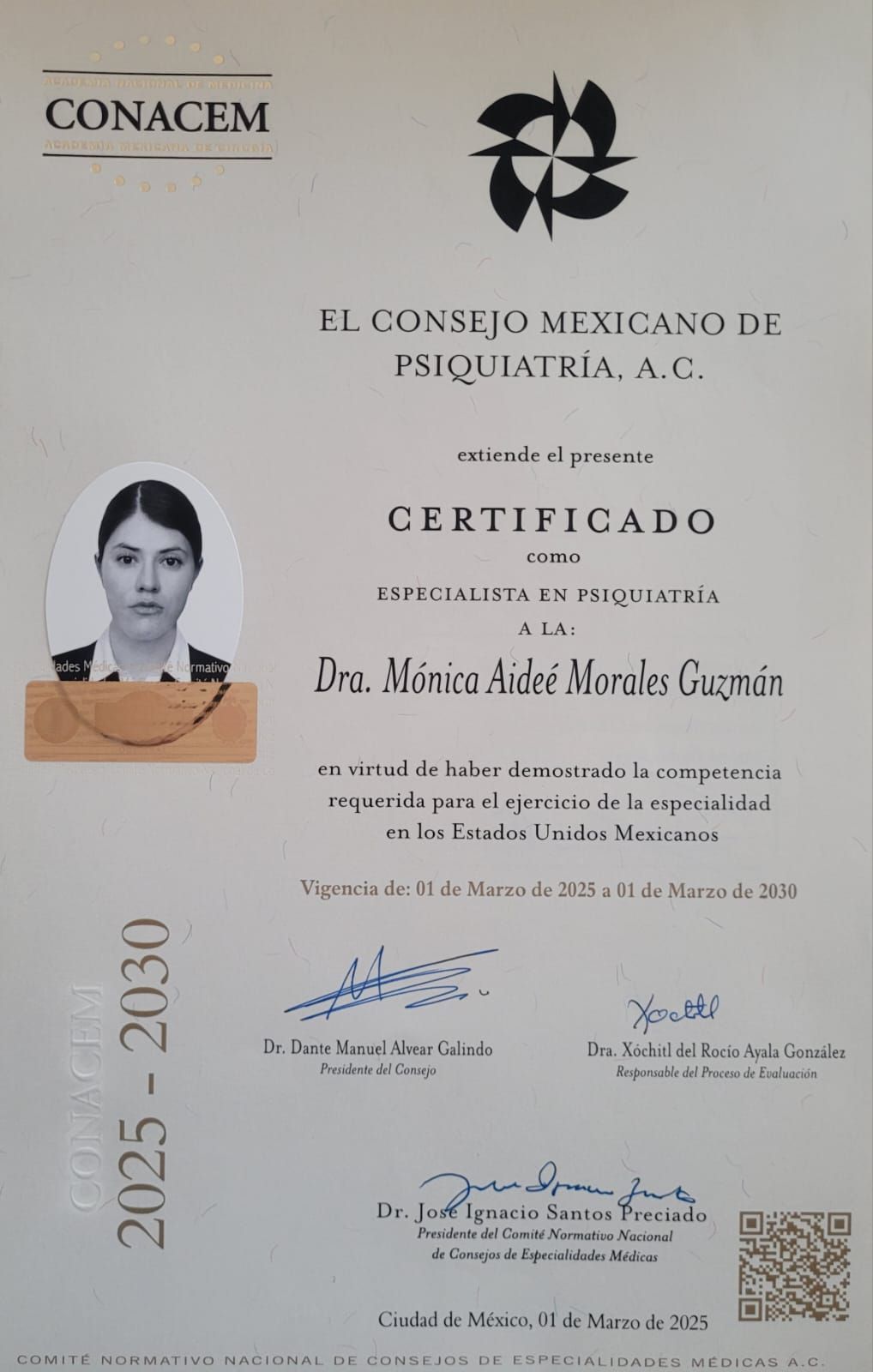 Soy médica especialista en psiquiatría, avalada por la UNAM. Médica cirujana egresada de la Facultad de Medicina de la UNAM. Certificada por el Consejo Mexicano de Psiquiatría.