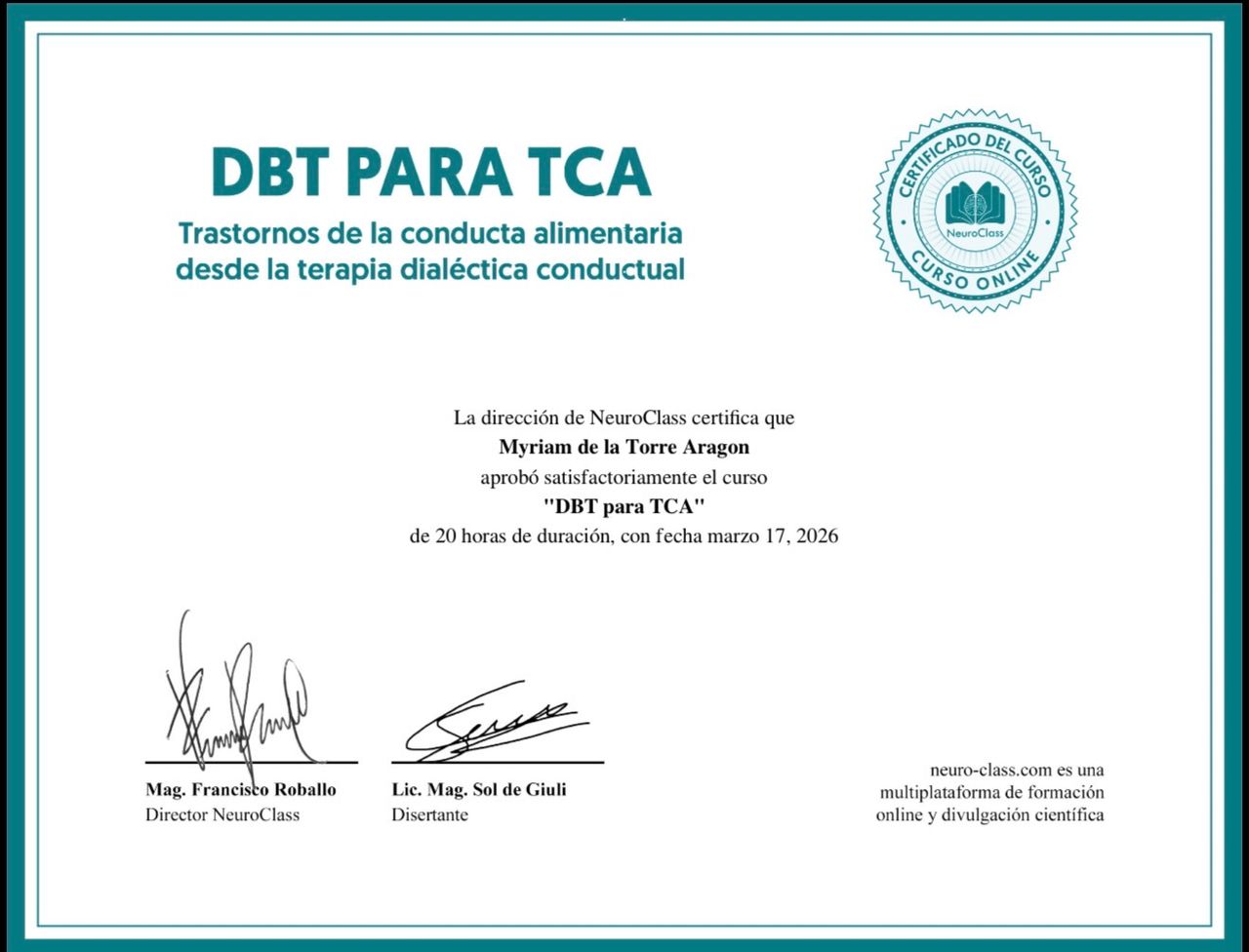 Soy licenciada en Psicología y me formé en Trastornos de la Conducta Alimentaria y Obesidad en la Universidad Europea de Madrid, actualmente acompaño a adolescentes y adultos jóvenes que buscan mejorar su relación con la comida, su cuerpo y sus emociones.