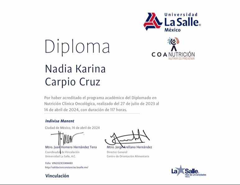 Especialista en asesoría nutricional de acuerdo a sintomatología presente en pacientes oncológicos