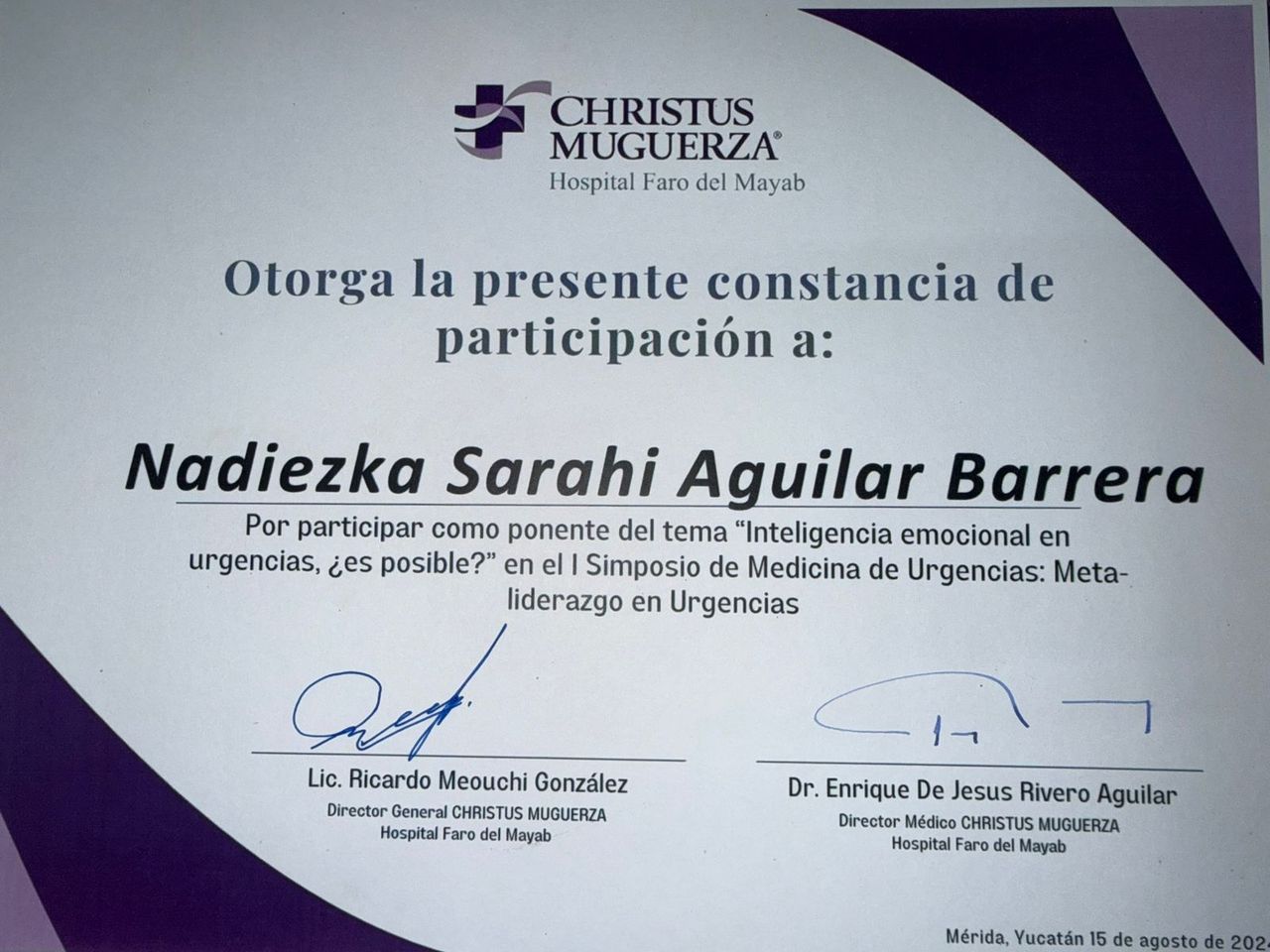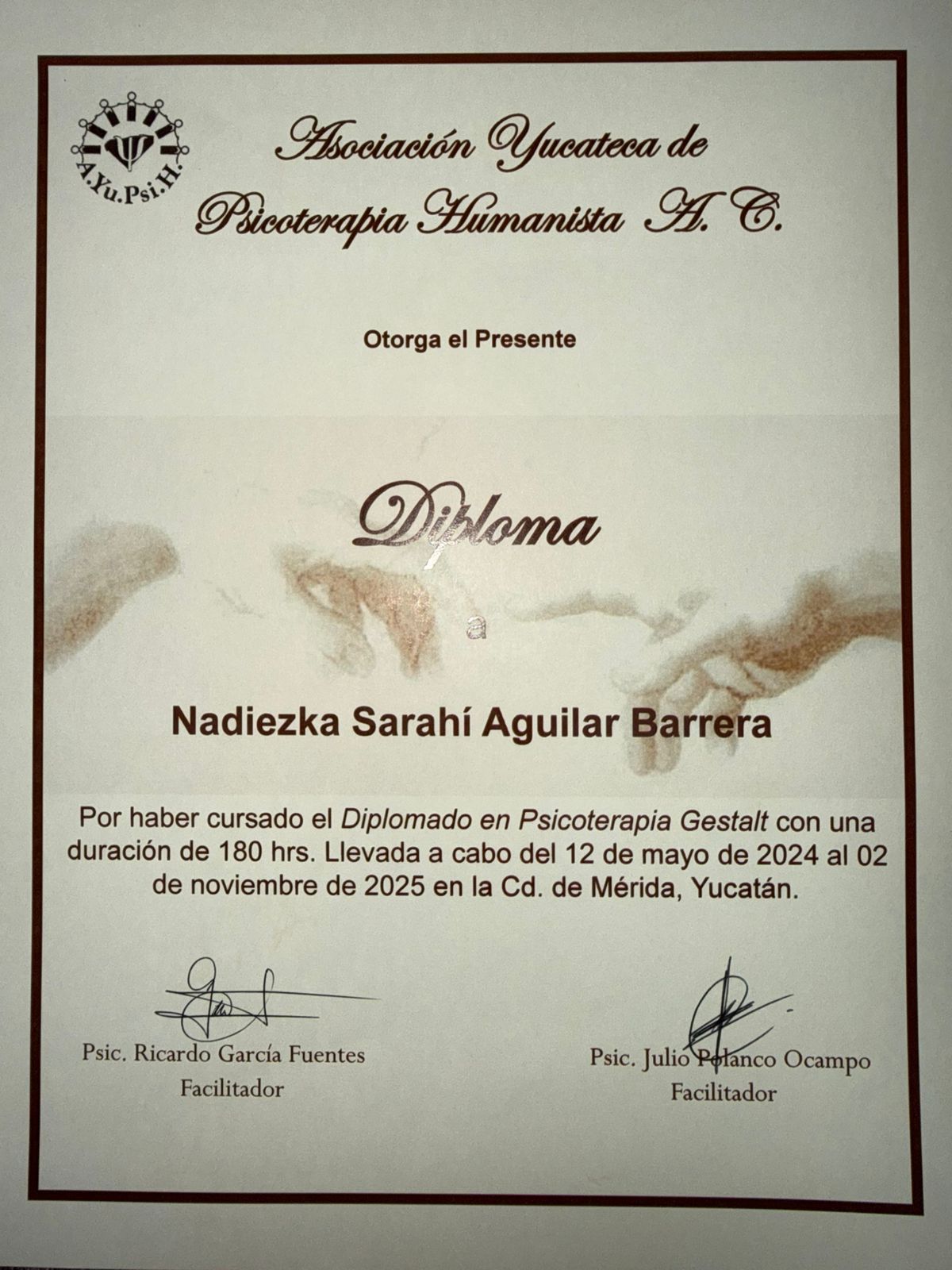 Diplomado en Psicoterapia Gestalt por la Asociación Yucateca de Psicoterapia Humanista.