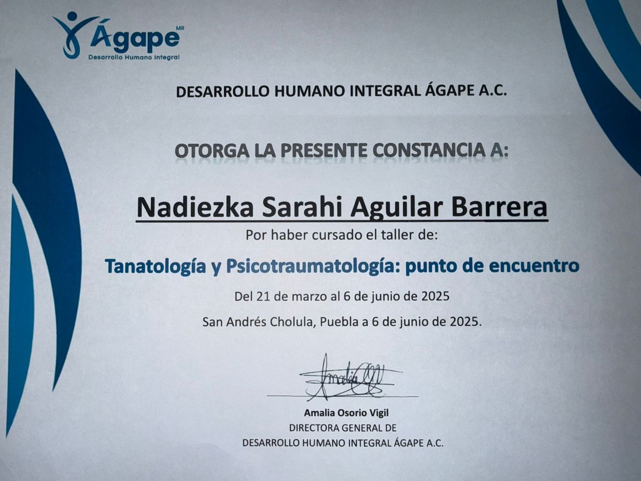 Formación en Tanatología y Psicotraumatología por el centro de Desarrollo Humano Integral ÁGAPE.