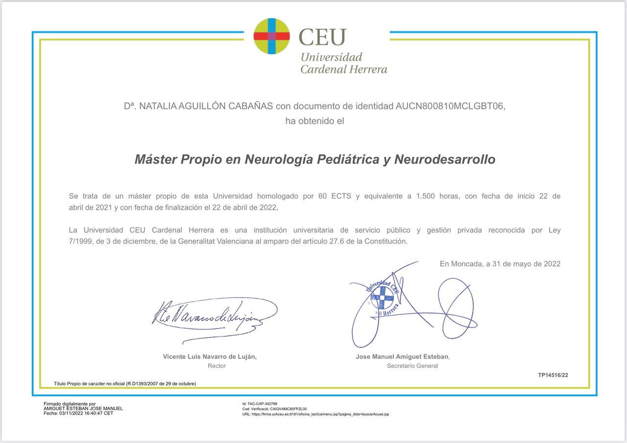Estoy certificada por la Universidad Autónoma de Ciudad Juárez en Pediatría, además de contar con una Maestría en Neurología Pediátrica y Neurodesarrollo por la Universidad Cardenal Herrera, España.