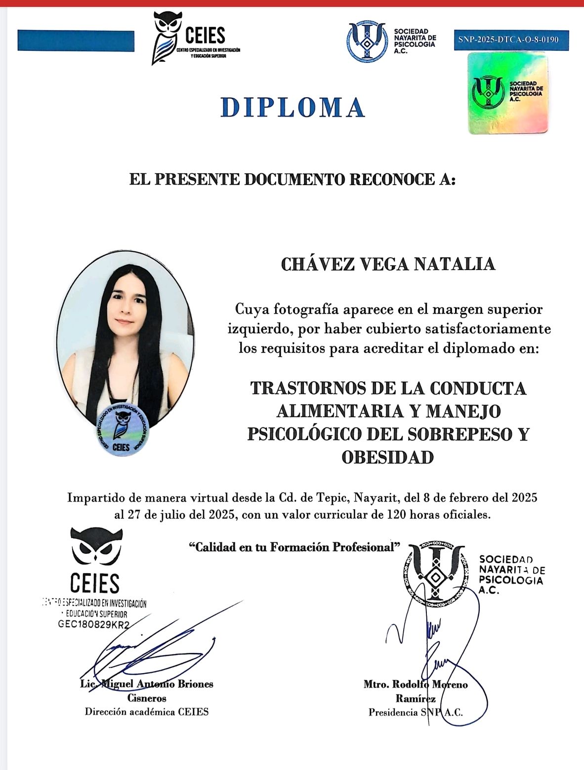 También cuento con diplomados en Neuropsicología; Aplicación de pruebas neuropsicológicas; y Psiquiatría infantil y de adolescentes que me ha sido de utilidad en el manejo de Trastorno por déficit de atención con hiperactividad.