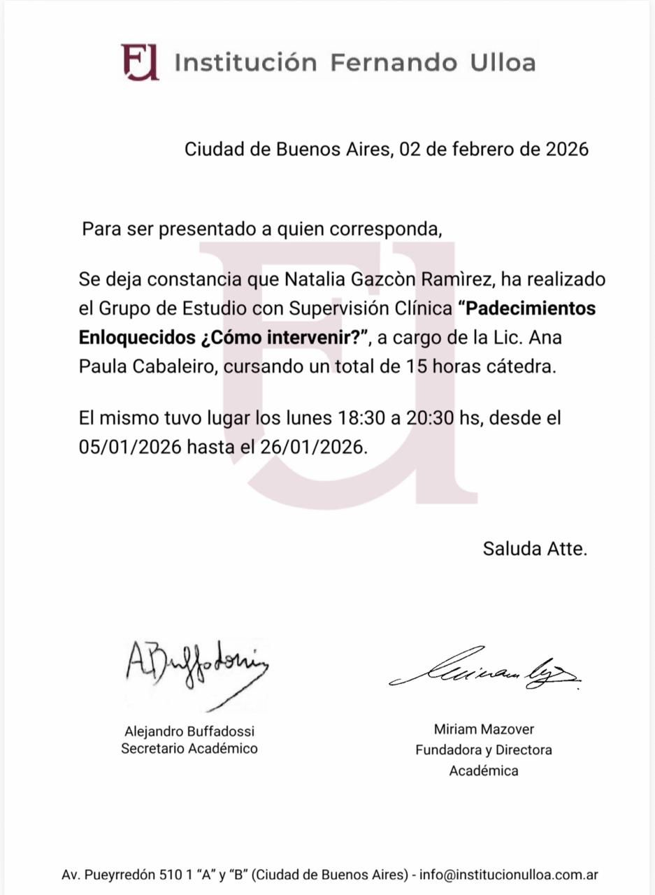 Me sentí muy a gusto, con mucha confianza en expresarme sin sentirme juzgada, con un trato muy profesional y con mucha empatía,.muchas gracias por su atención Maestra Natalia Gazcón!