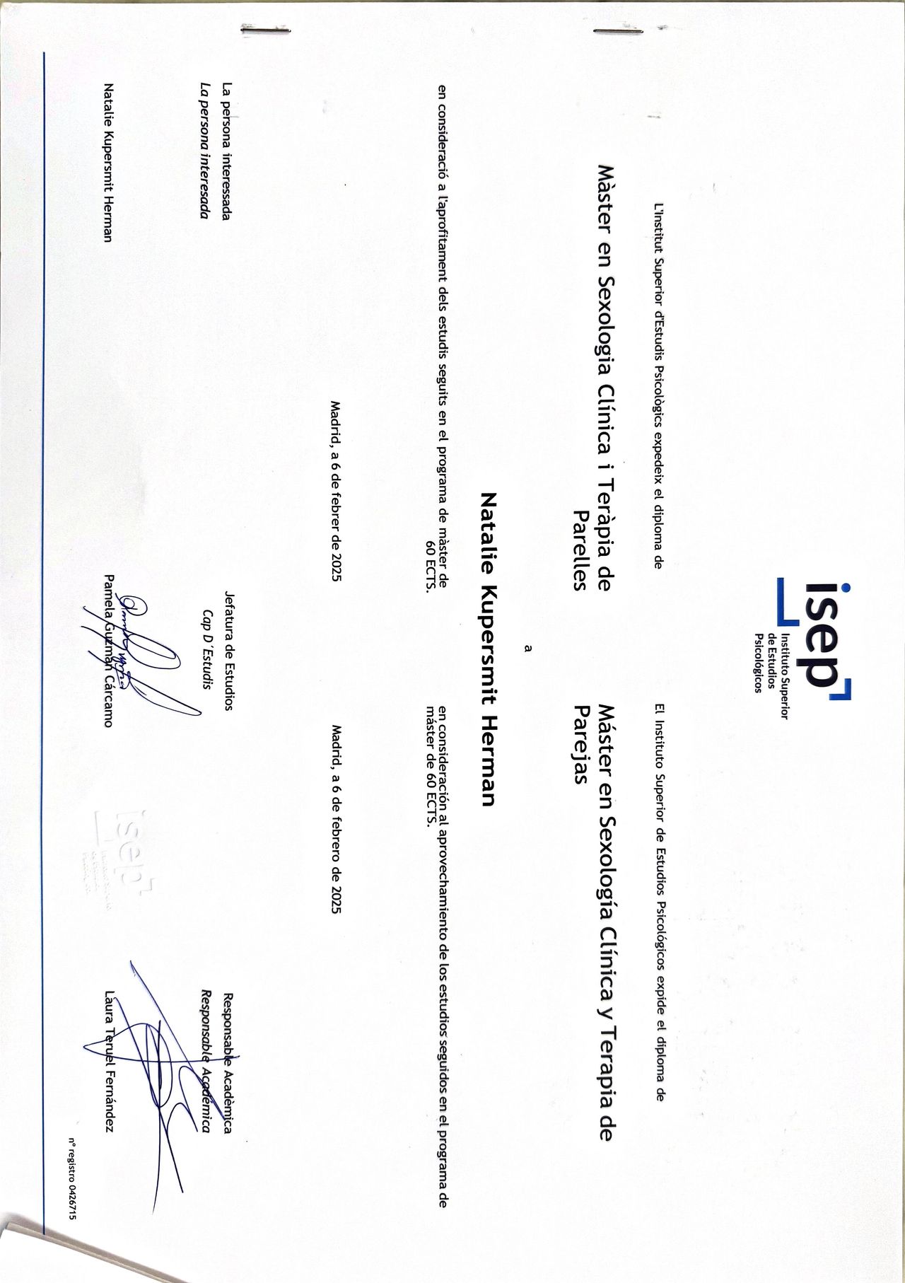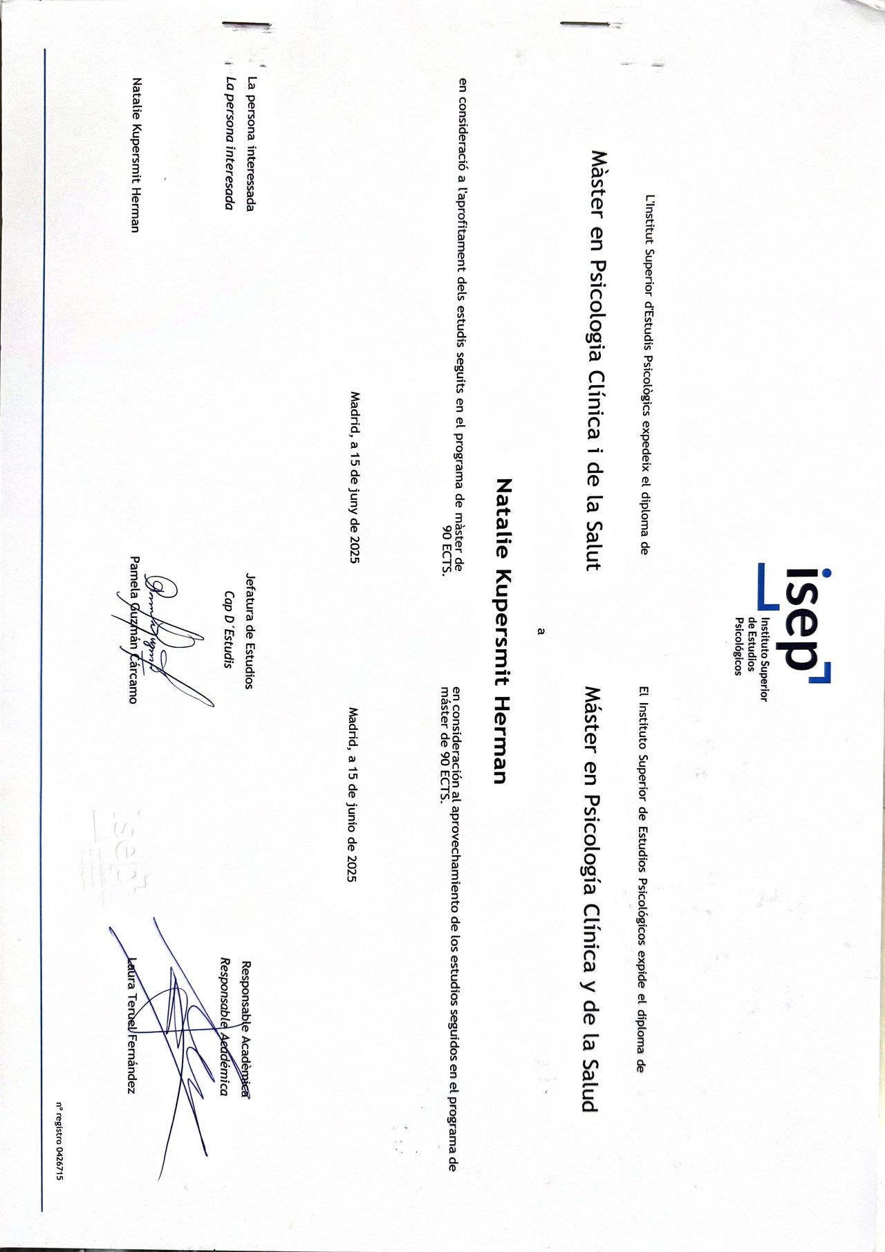Recomiendo total y abiertamente a Natalie como psicóloga, muy preparada, empática , sabe llevar las sesiones muy bien y me ha ayudado mucho.