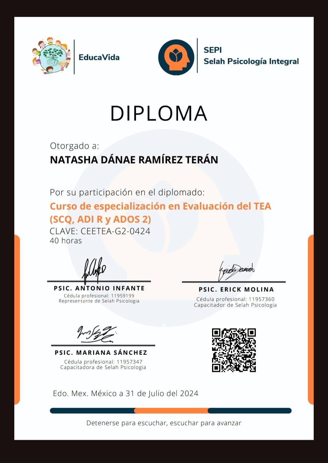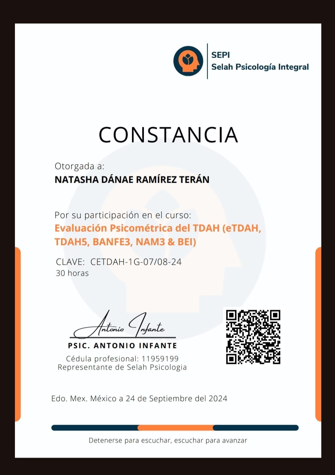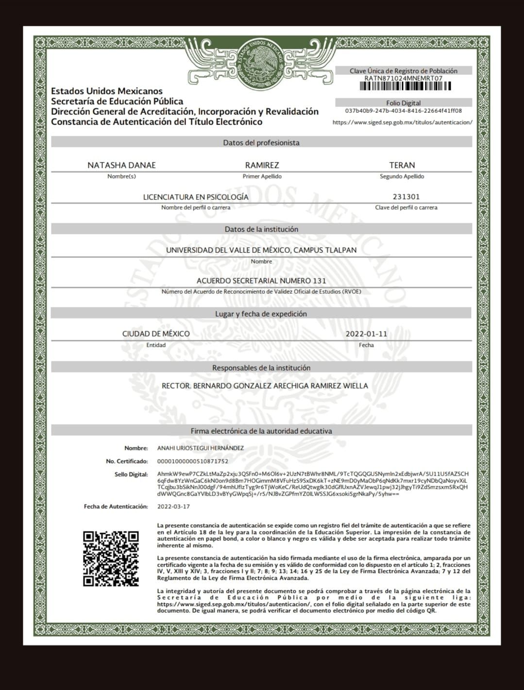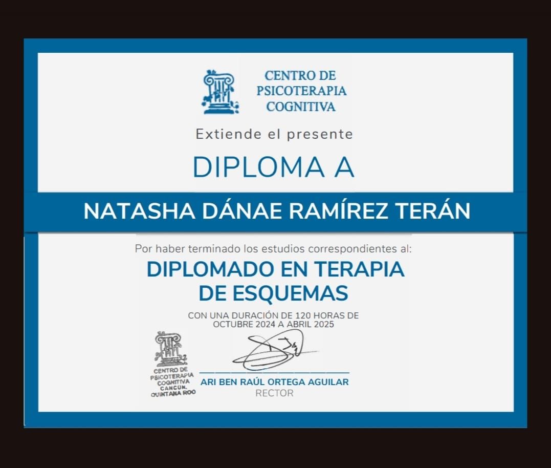Mi experiencia con el acompañamiento psicológico de la psicólogo Natasha Ramírez es satisfactoria en especial por que mi hija quien es la paciente ya sabe colocar límites claros y diferenciar; también hay cambios satisfactorios en la conducta de mi hija en la escuela y actividades extras el acompañamiento psicológico la ayudo a mejorar su concentración y a tener mejores herramientas para afrontar situaciones del día a día !
