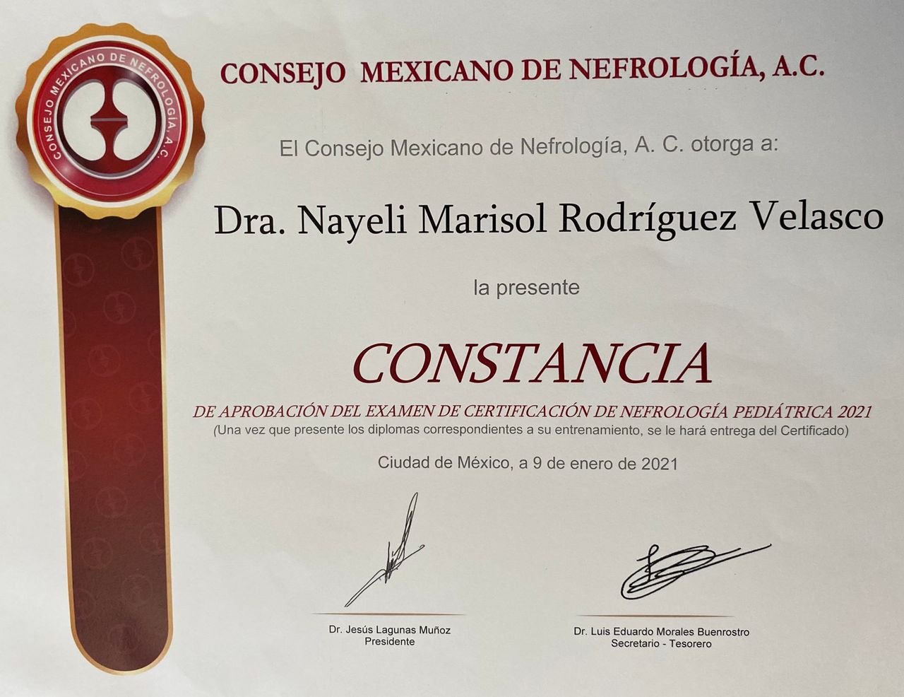 Estoy certificada por el Consejo Mexicano de Certificación en Pediatría y por el Consejo Mexicano de Nefrología.
