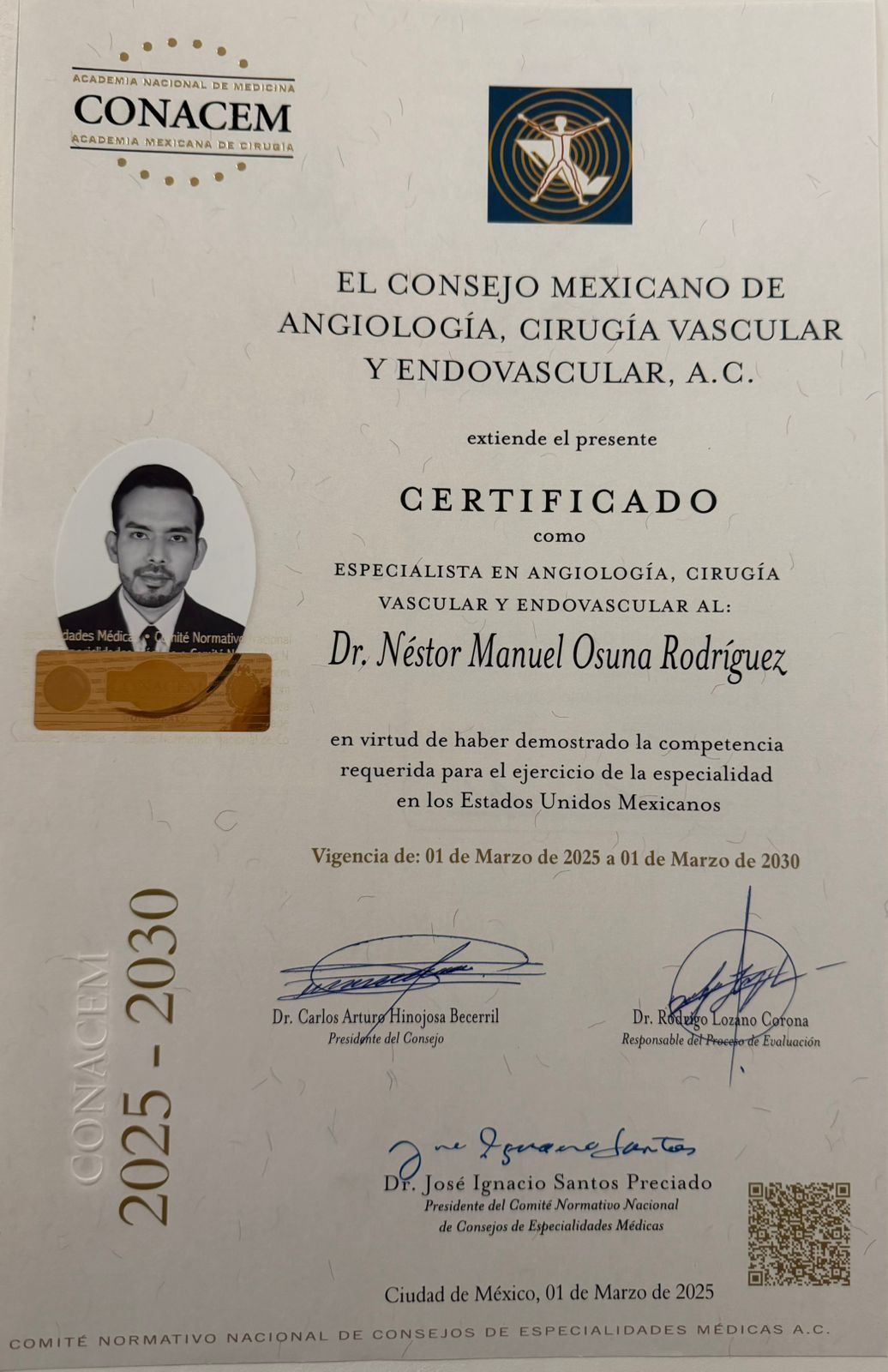 Soy el Dr. Néstor Manuel Osuna Rodríguez, Angiólogo y Cirujano Vascular, egresado del Hospital de Especialidades del Centro Médico Nacional Siglo XXI, uno de los hospitales más importantes en la formación de especialistas en cirugía vascular en México.