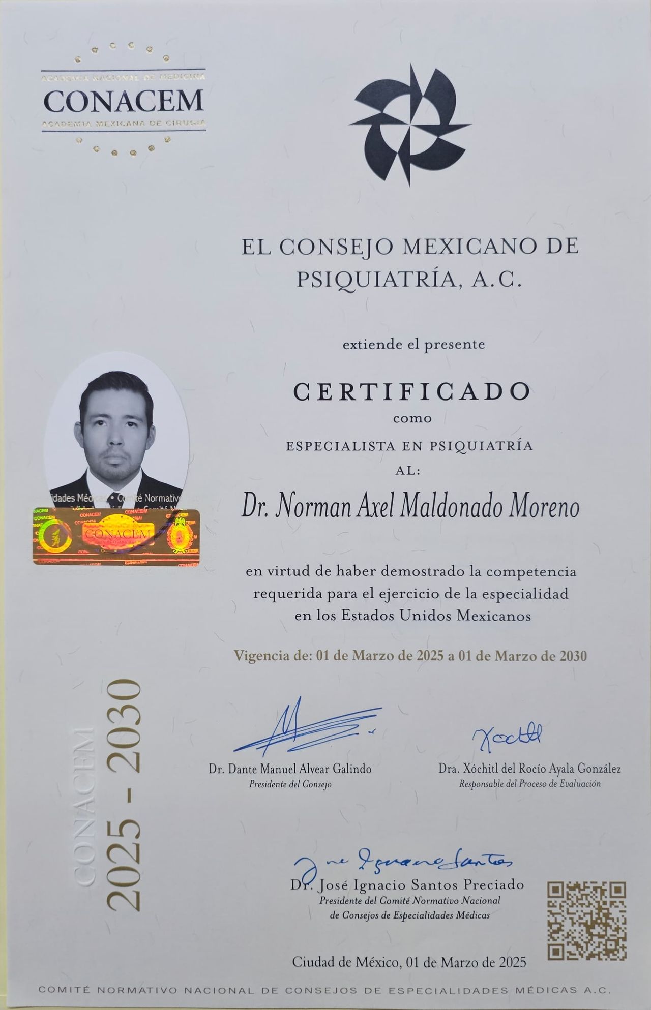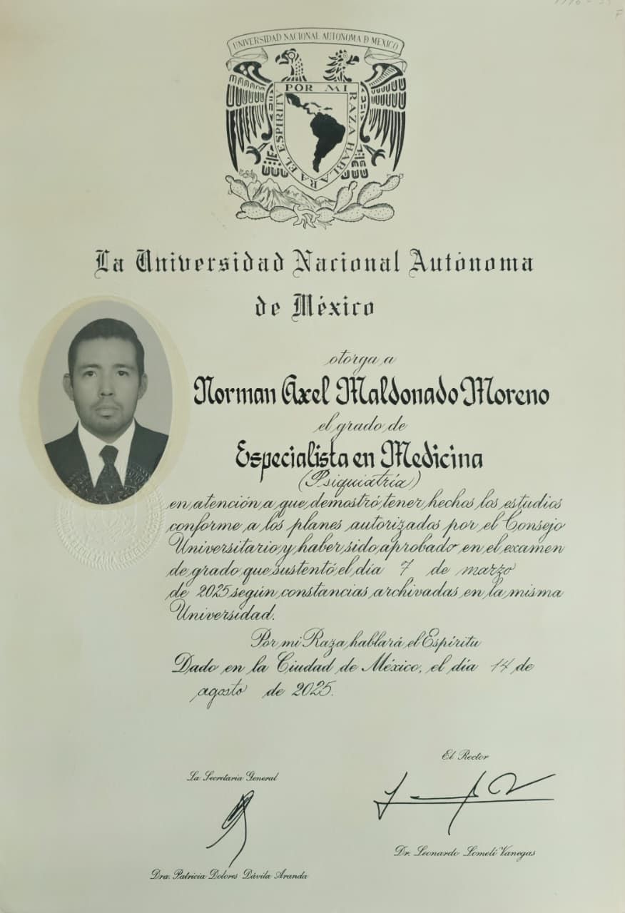 Soy Médico Psiquiatra orgullosamente egresado de Centro Médico Nacional Siglo XXI (IMSS) a través del programa de especialidades médicas de la UNAM.
