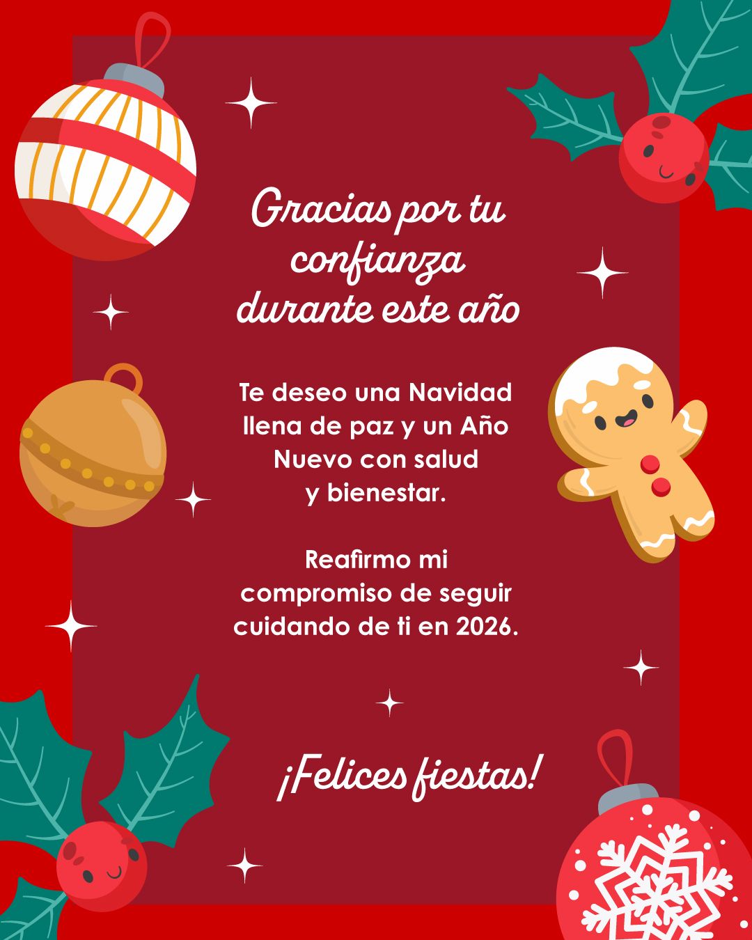 En este cierre de año quiero agradecer profundamente la confianza que depositaron en mí para acompañarlos en su salud y bienestar. Cada consulta, cada seguimiento y cada mensaje han significado un compromiso constante para brindarles la mejor atención posible.