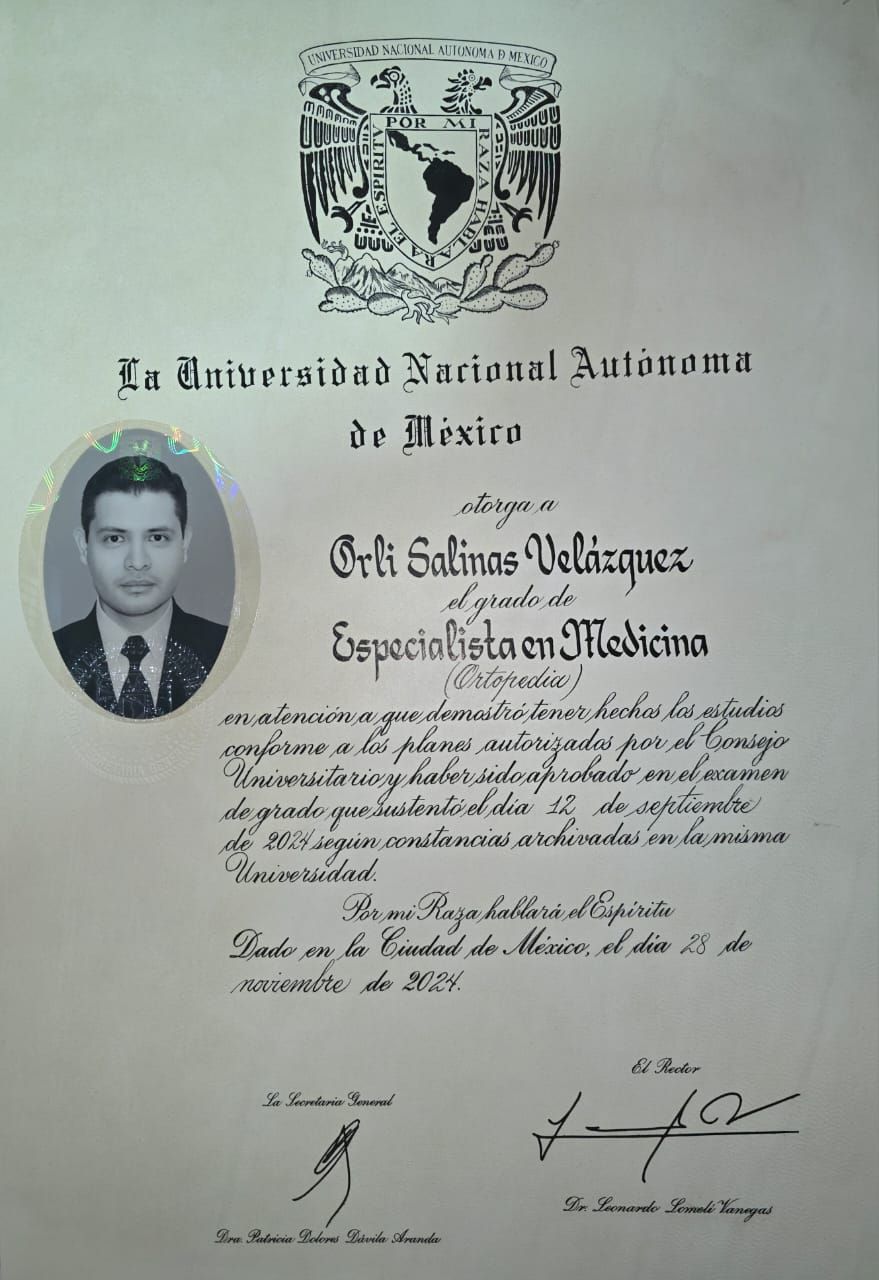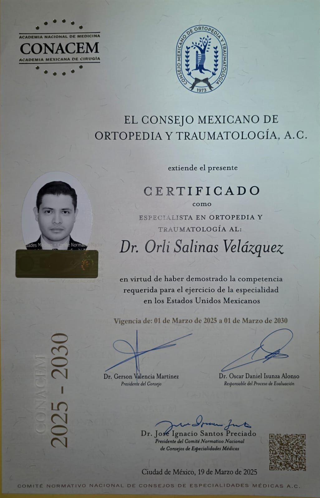 Soy el Dr. Orli Salinas, soy traumatólogo y ortopedista decidí especializarme en traumatología ortopédica con enfoque en cirugía articular porque me apasiona ayudar a las personas a recuperar su movilidad y, con ello, su calidad de vida. Siempre me ha atraído la precisión y el reto técnico que implica operar una articulación, ya sea por una lesión traumática o una enfermedad degenerativa. Ver cómo un paciente que antes no podía caminar sin dolor vuelve a moverse con libertad es una de las mayores recompensas de esta profesión. Además, me motiva estar en constante aprendizaje, incorporando nuevas técnicas y tecnologías que mejoran los resultados quirúrgicos y aceleran la recuperación. Para mí, esta especialidad representa un equilibrio perfecto entre ciencia, habilidad y humanidad, por lo que estoy comprometido con la actualización médica continua, el enfoque multidisciplinario y la atención ética y de alta calidad al paciente.