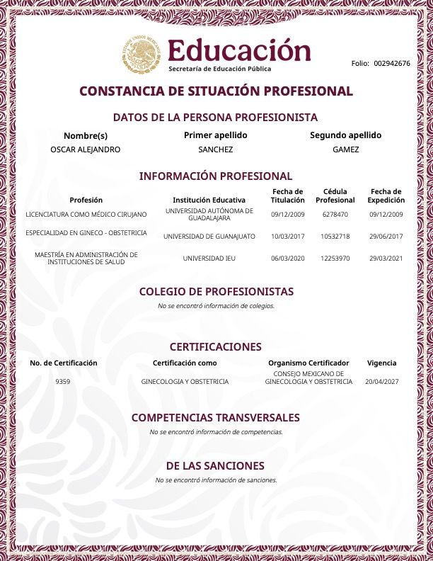 Hola! Soy el Dr. Oscar, especialista en Ginecología y Obstetricia por la Universidad de Guanajuato, Médico Fetal por la Universidad de Barcelona y diplomado de Laparoscopia Ginecológica por la Universidad Autónoma de Querétaro.