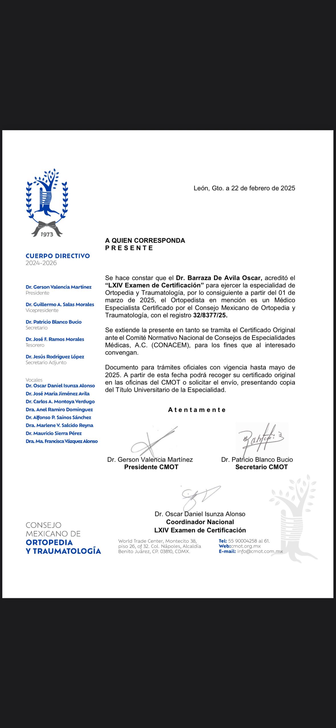Con una sólida formación en cirugía ortopédica y traumatología, y una actualización constante en las más recientes técnicas médicas, busco ofrecer soluciones efectivas y seguras ante lesiones musculoesqueléticas, fracturas, patologías articulares y condiciones deportivas, tanto en adultos como en pacientes jóvenes.