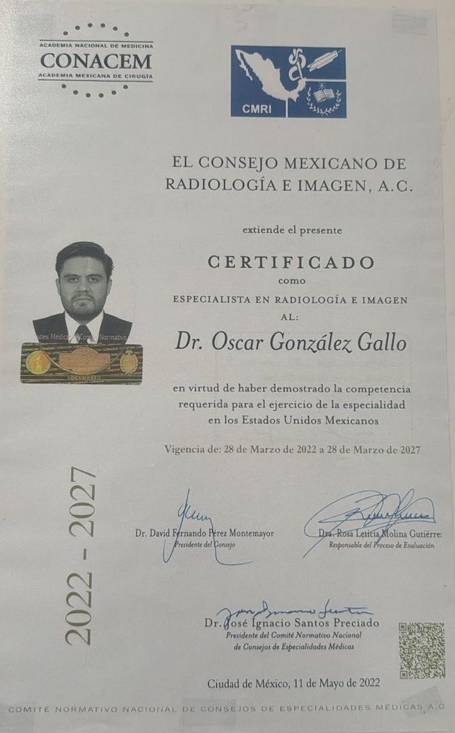 Realicé la especialidad de radiología en el Hospital General GEA González en Ciudad de México y alta especialidad de radiología intervencionista en el Hospital 1° de Octubre en Ciudad de México. Formo parte del Consejo Mexicano de Radiología e Imagen. Actualmente participo en el Instituto Oncológico de Queretaro dentro del Hospital Angeles Centro Sur.