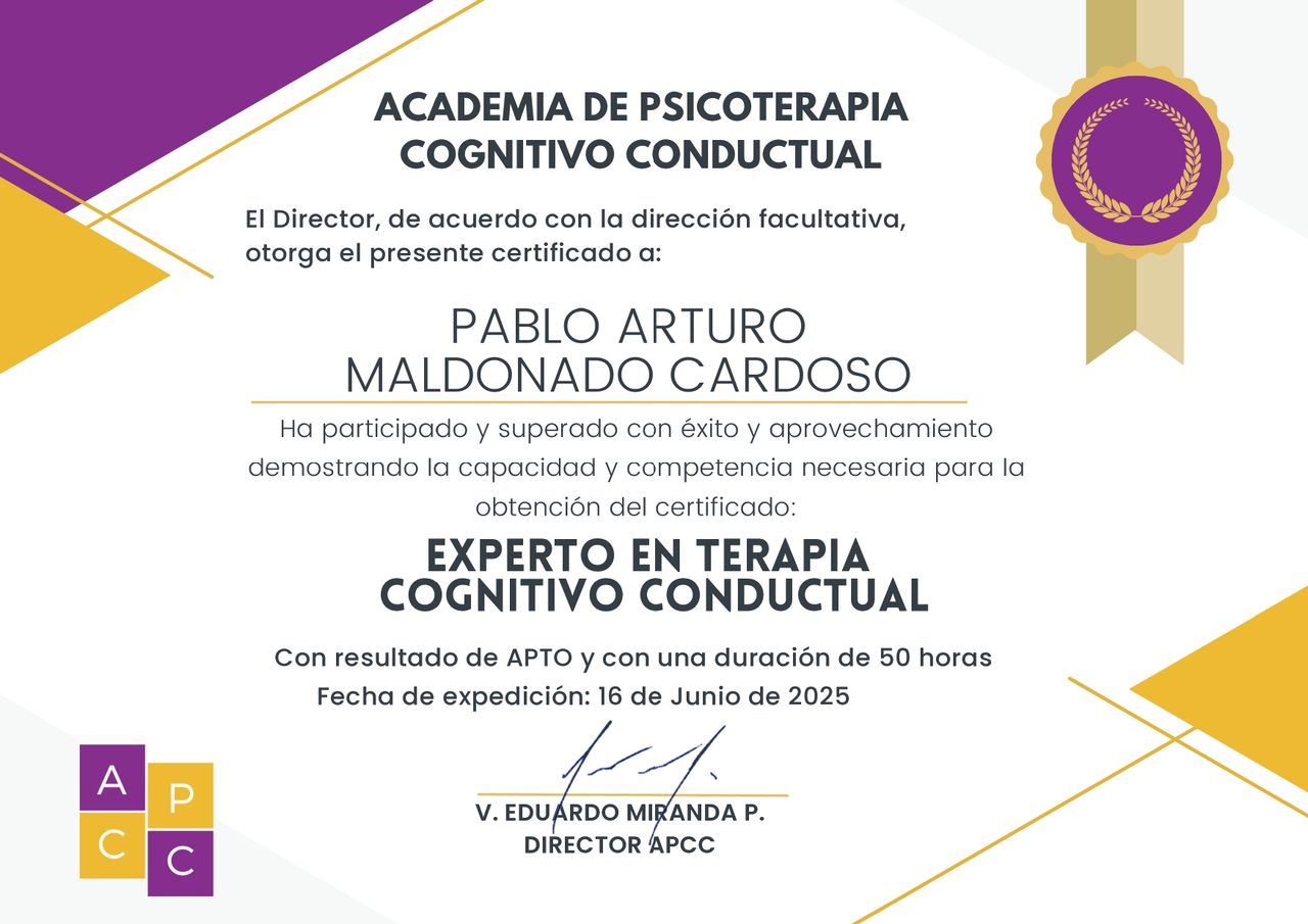 Psicólogo especializado en terapia cognitivo conductual (TCC), enfocado en problemas de ansiedad y depresión.