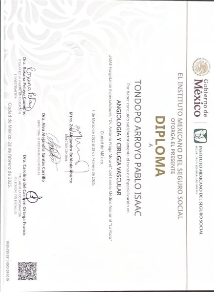 Soy el Dr. Pablo Isaac Tondopó Arroyo, especialista en Angiología y Cirugía Vascular y Endovascular. Me formé como Angiólogo, cirujano vascular y endovascular en el Centro Médico Nacional “La Raza”, avalado por la Universidad Nacional Autónoma de México, y desde entonces me he dedicado a brindar atención médica de excelencia en Tuxtla Gutiérrez, Chiapas.