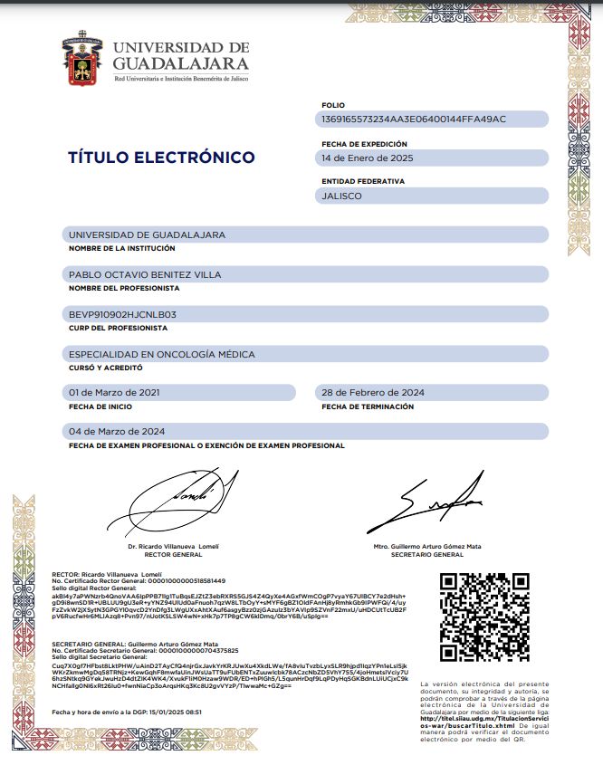 Soy médicoOncólogo certificado por el Consejo Mexicano de Oncología,asi como por la Sociedad Europea de Oncologia Medica ESMO con atención en Guadalajara y su zona metropolitana.