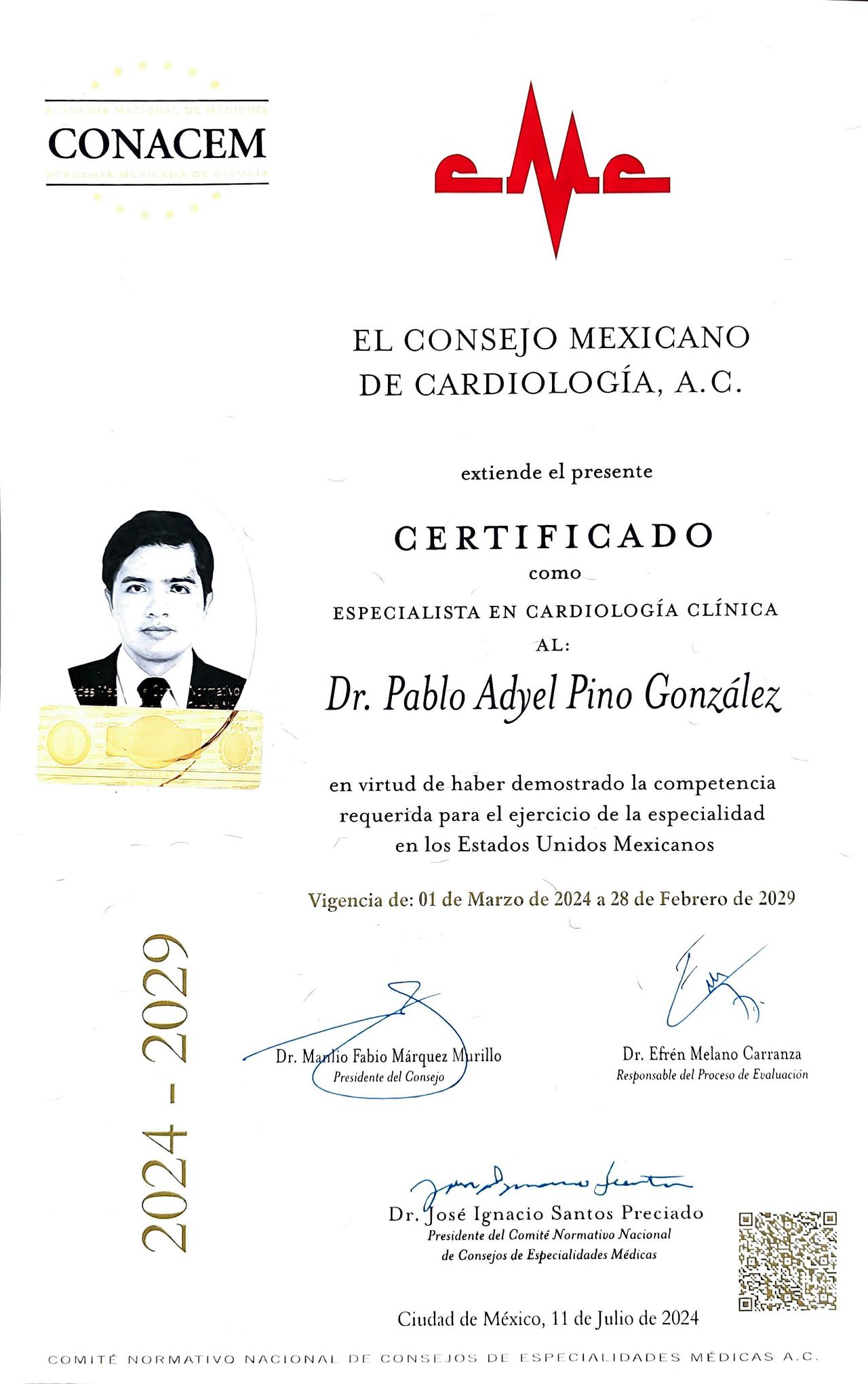 - Certificación por el Consejo Mexicano de Cardiología y Consejo Mexicano de Cardiología Intervencionista.
