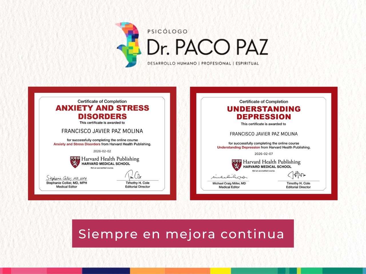 He participado en programas de formación ejecutiva como el Management Development Program en IAE Business School, Argentina, y el Advanced Management Program en Rice University, Estados Unidos. Además, he completado cursos en Harvard Medical School sobre trastornos de ansiedad, estrés y comprensión de la depresión.