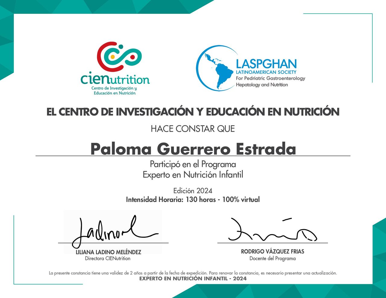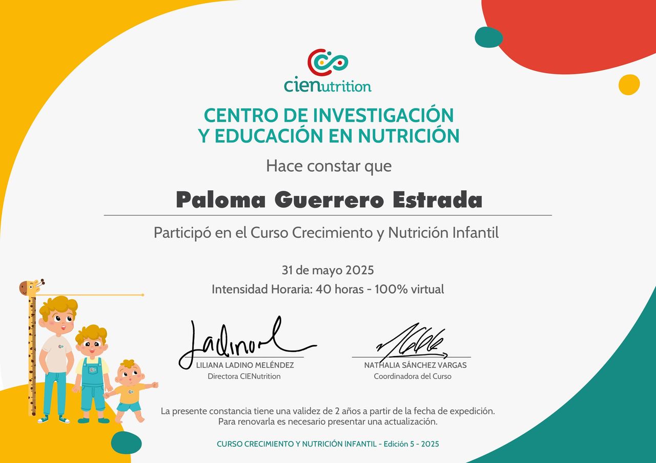 Dentro de mi formación académica sobresalen mis estudios en nutrición infantil con un enfoque particular en alimentación complementaria, picky eater y obesidad infantil.