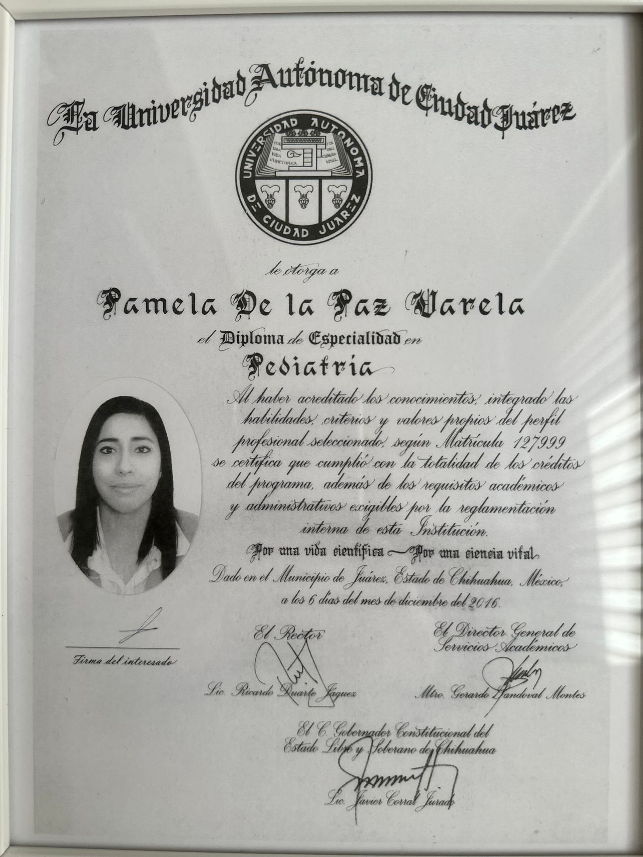 Con especialidad en Pediatría, egresada del Hospital Infantil de Especialidades de Cd. Juárez, Universidad Autónoma de Cd. Juárez, cédula especialidad 10522791.