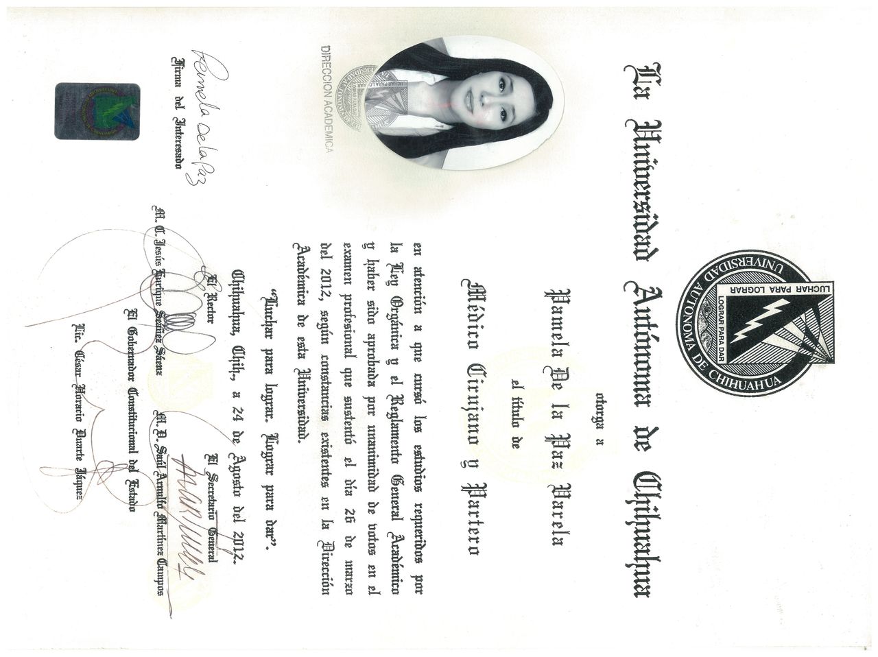 Soy médico cirujano y partero, egresada de la facultad de medicina de la Universidad Autónoma de Chihuahua, cedula 7915740.